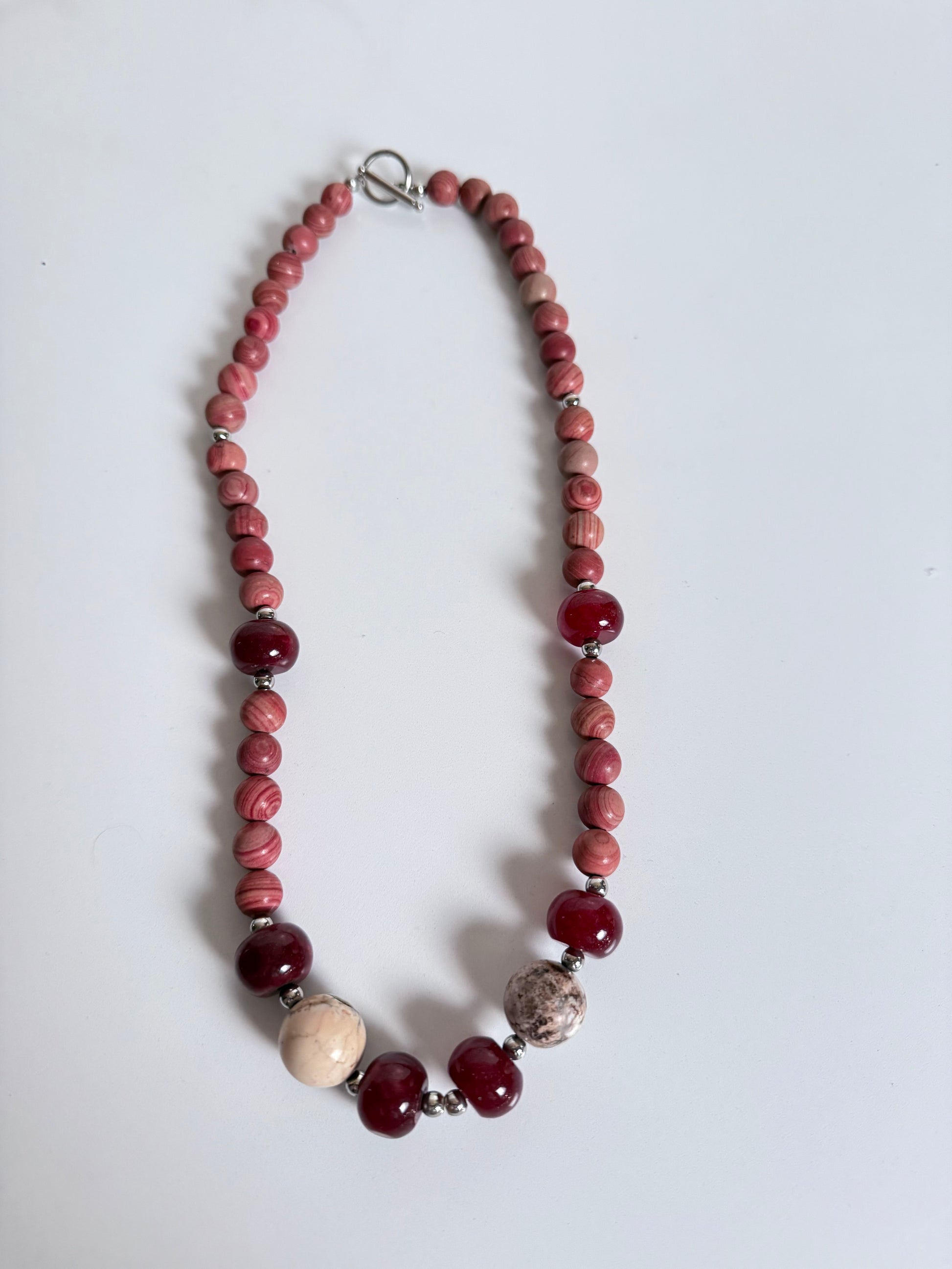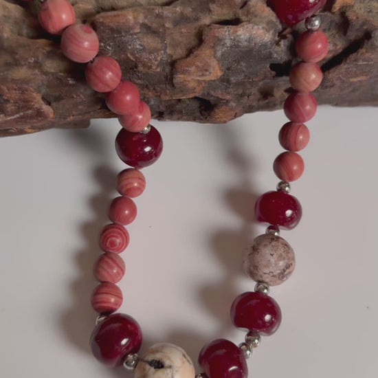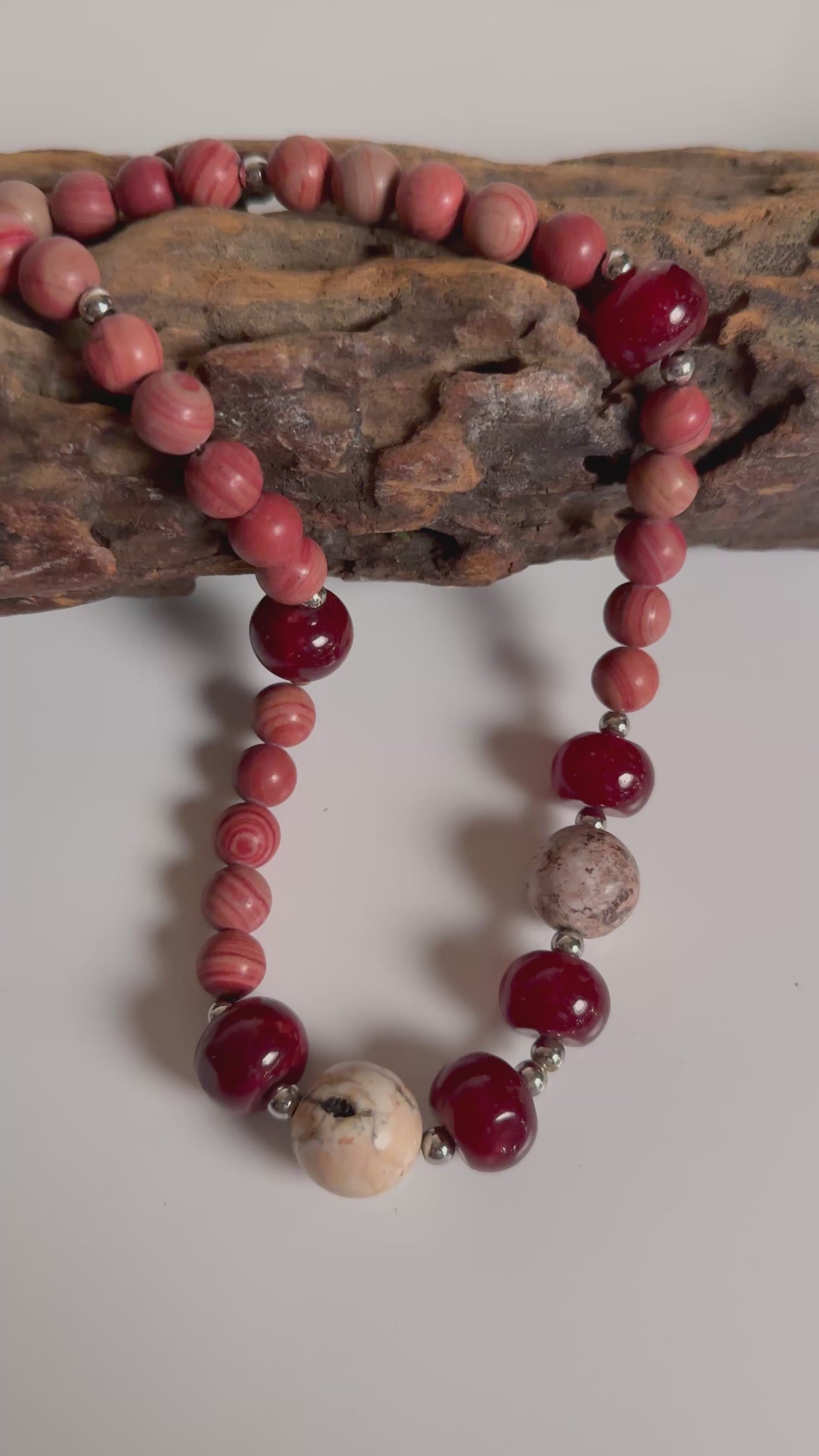 Hand-strung with natural gemstone beads in warm rose, deep cherry, and soft neutral tones, this one-of-a-kind necklace brings a refined, earthy elegance to any look. The bold center stones anchor the piece with quiet confidence, while the surrounding Rhodochrosite-toned beads create a soft, feminine gradient that flatters every skin tone.