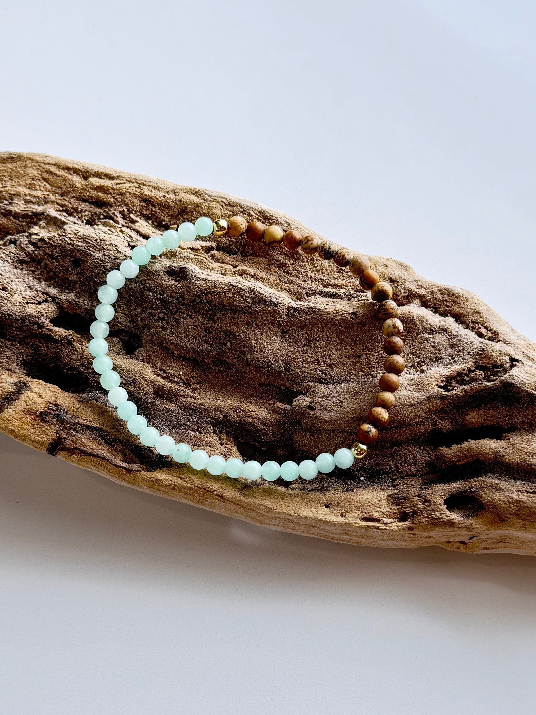 Grounded yet serene, the Desert Sky Bracelet pairs earthy matte jasper with the cool, calming tones of aventurine and a single 8ky gold filled bead. This 6 ½” stretch design blends warm natural textures with tranquil sea-glass hues, creating a versatile piece that balances strength and harmony. Perfect for stacking or wearing solo, it brings a touch of effortless elegance to any look