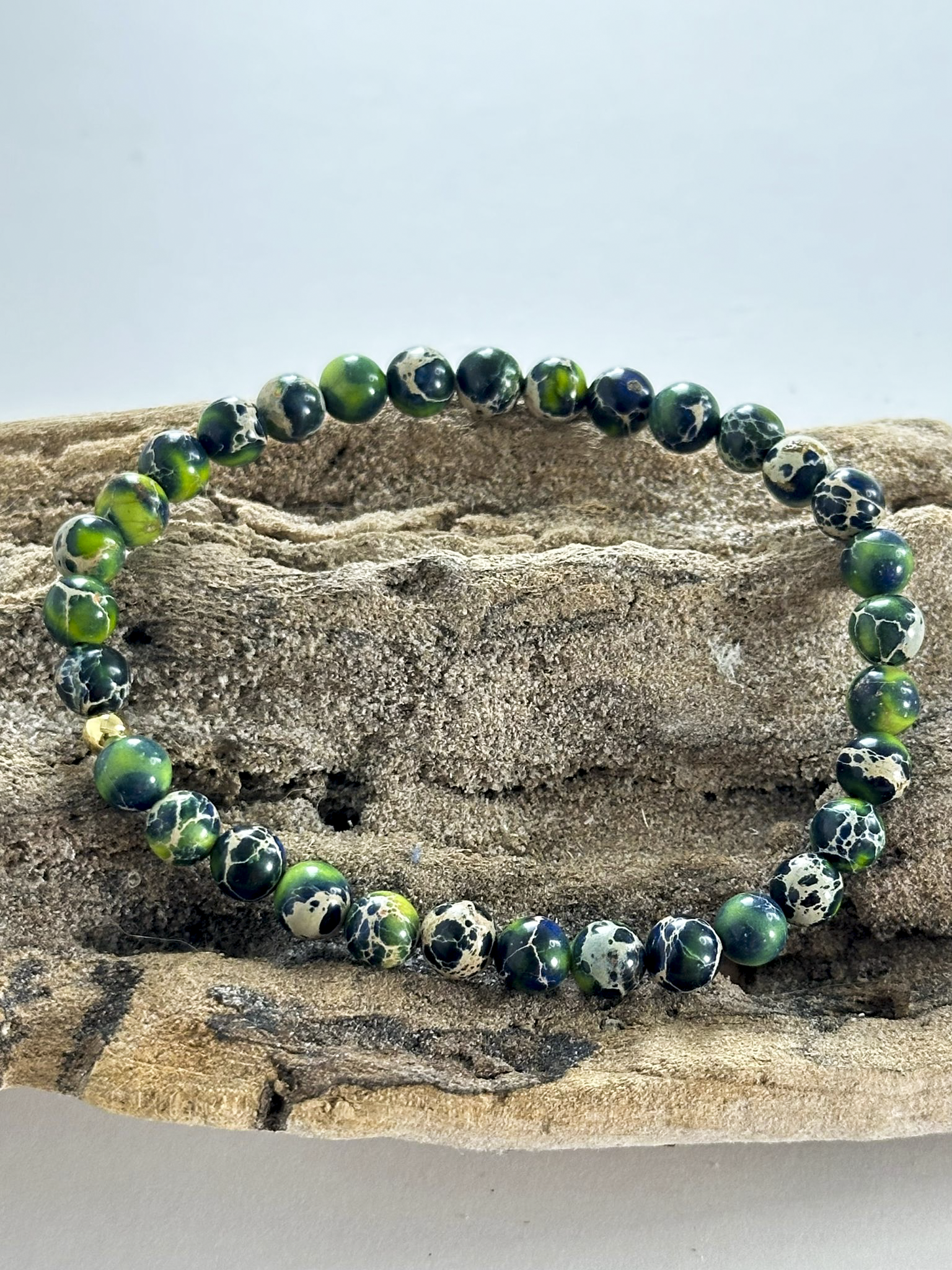 Vibrant green sea sediment jasper beads with mesmerizing crackled patterns, symbolizing vitality and courage. A single 18K gold-filled accent bead adds a touch of elegance to this earthy, powerful piece — ideal for everyday wear or stacking.
