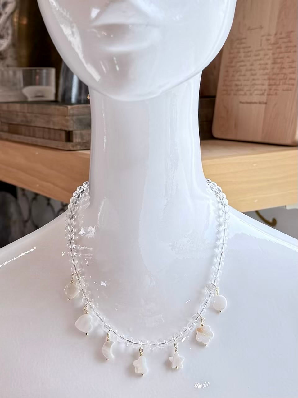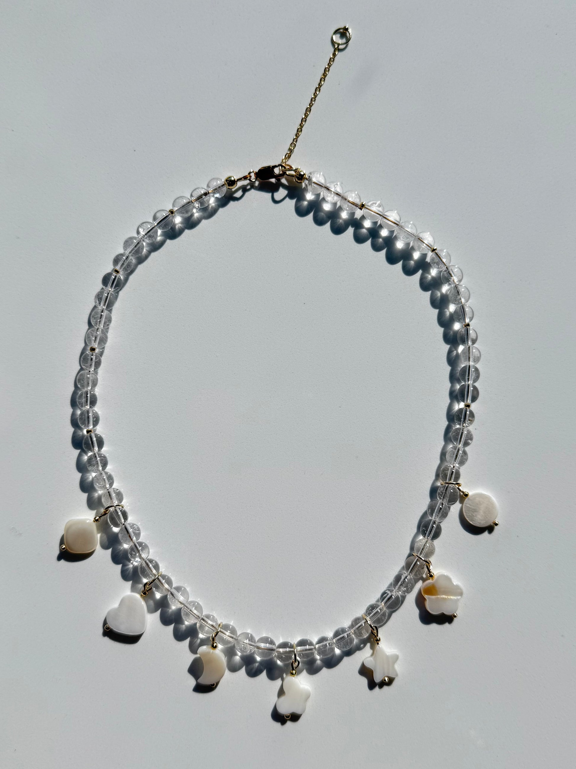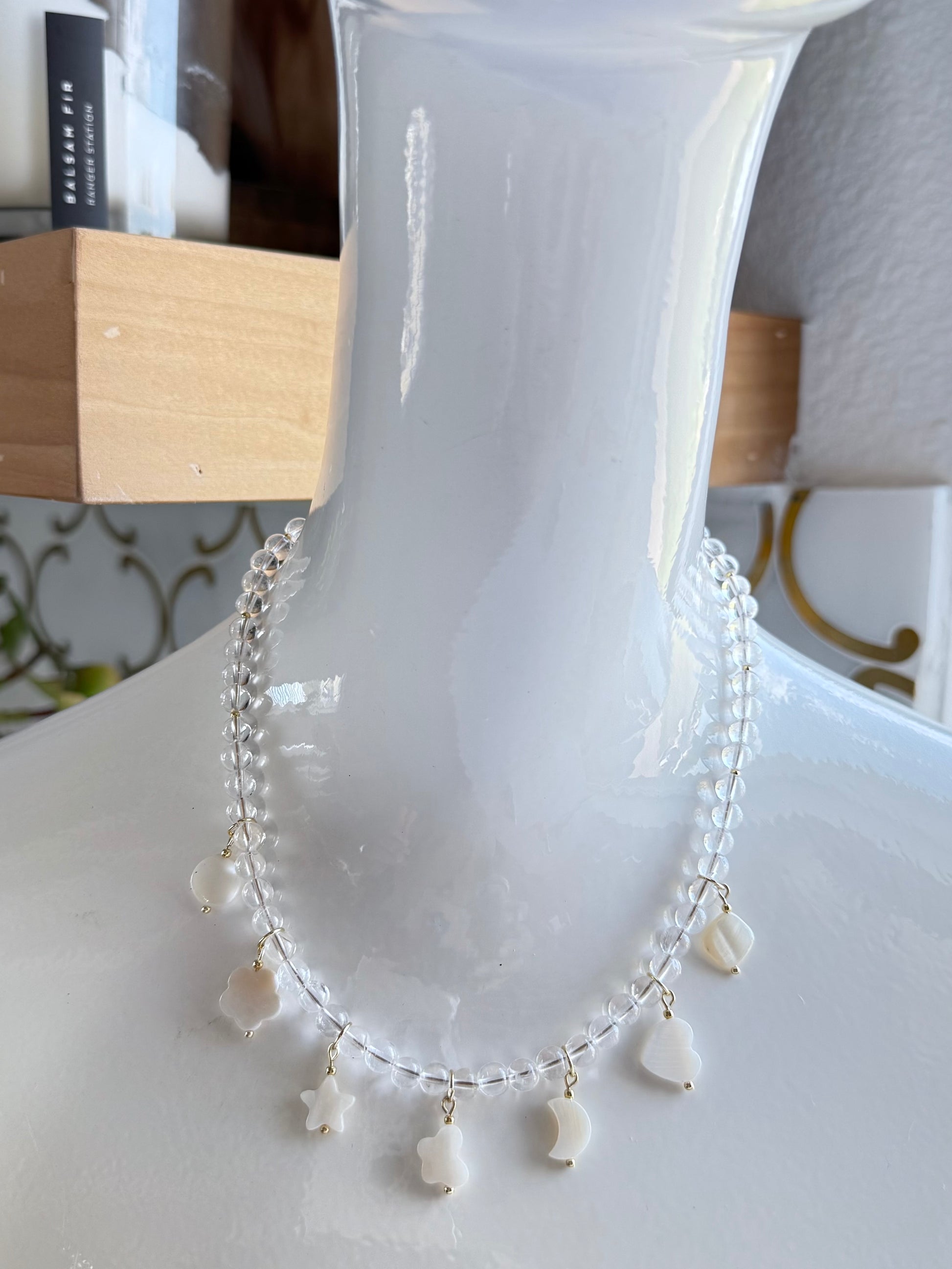Soft, luminous, and impossibly chic — captures the quiet magic of moonlight. Clear quartz beads shimmer with subtle radiance, while delicate mother-of-pearl charms—shaped as stars, moons, and organic motifs—dance with every movement. Gold-filled accents add warmth and refinement, creating a balance of ethereal light and modern luxury.