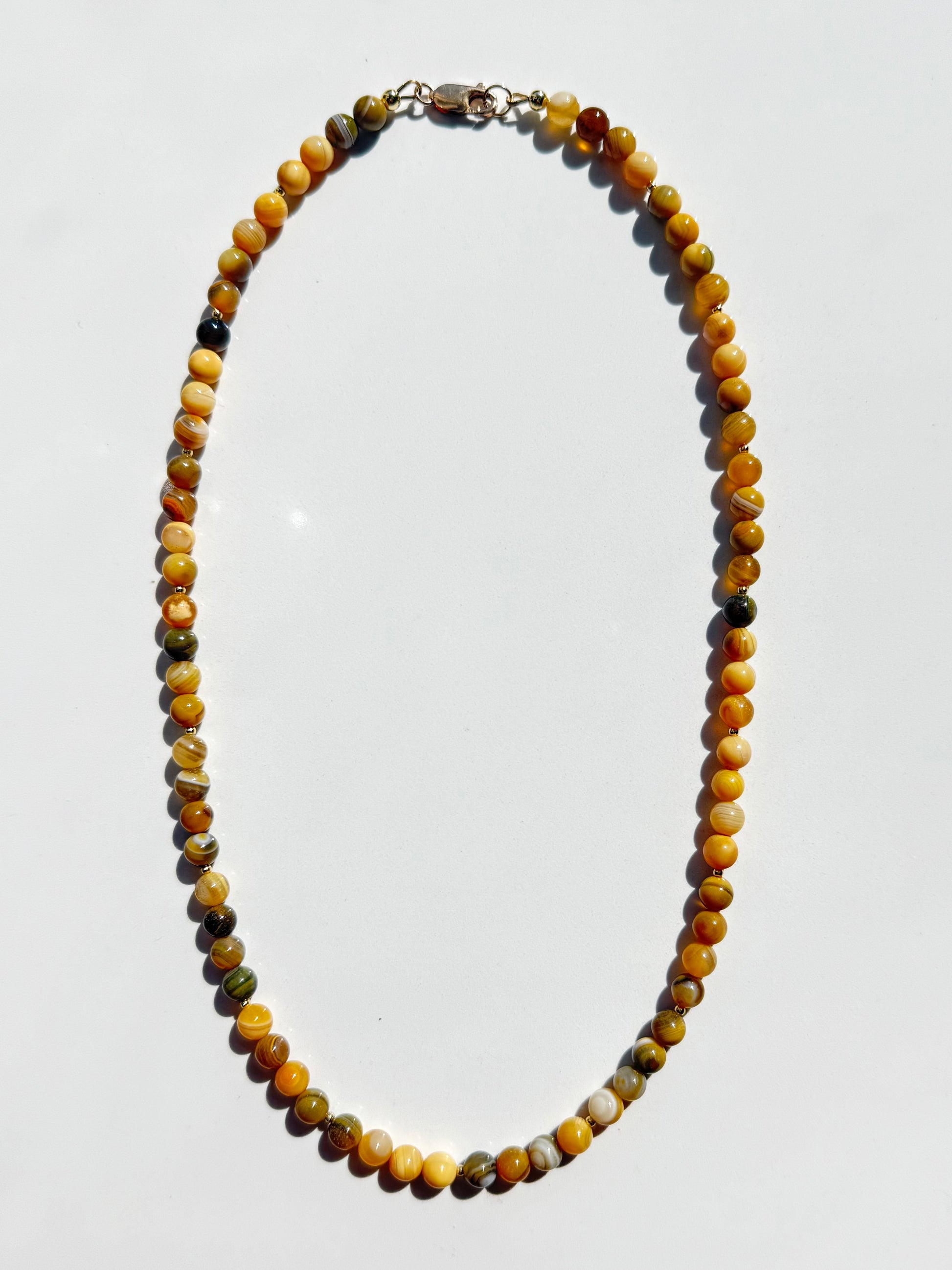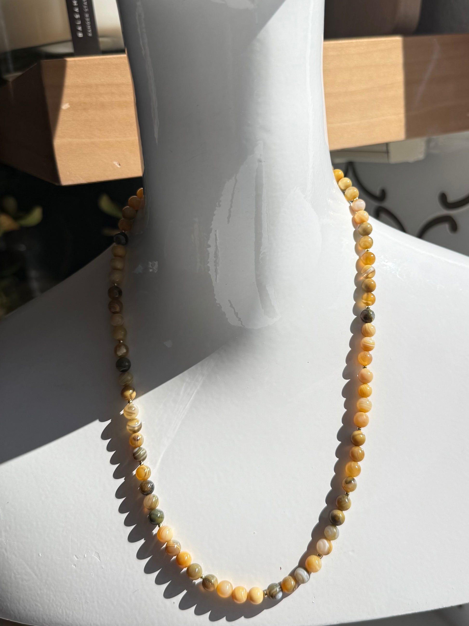 Warm, radiant, and effortlessly refined, The Golden Horizon Necklace captures the glow of a late-afternoon sun melting into the landscape. Hand-strung with bumble bee agate in rich honey, amber, and earthy olive tones, each bead reveals its own unique striation and character. The result is a polished yet organic look that brings instant warmth to your wardrobe.
