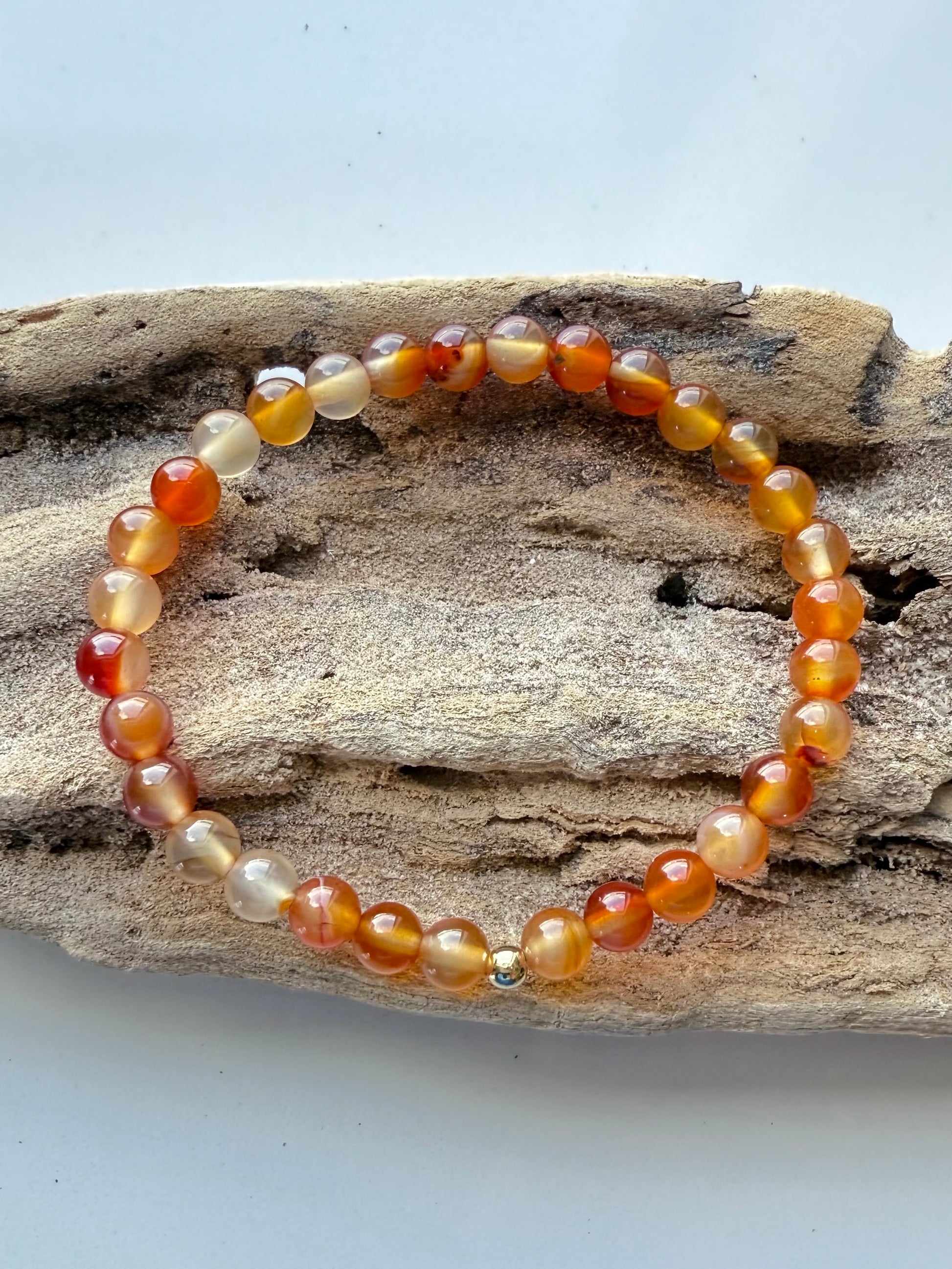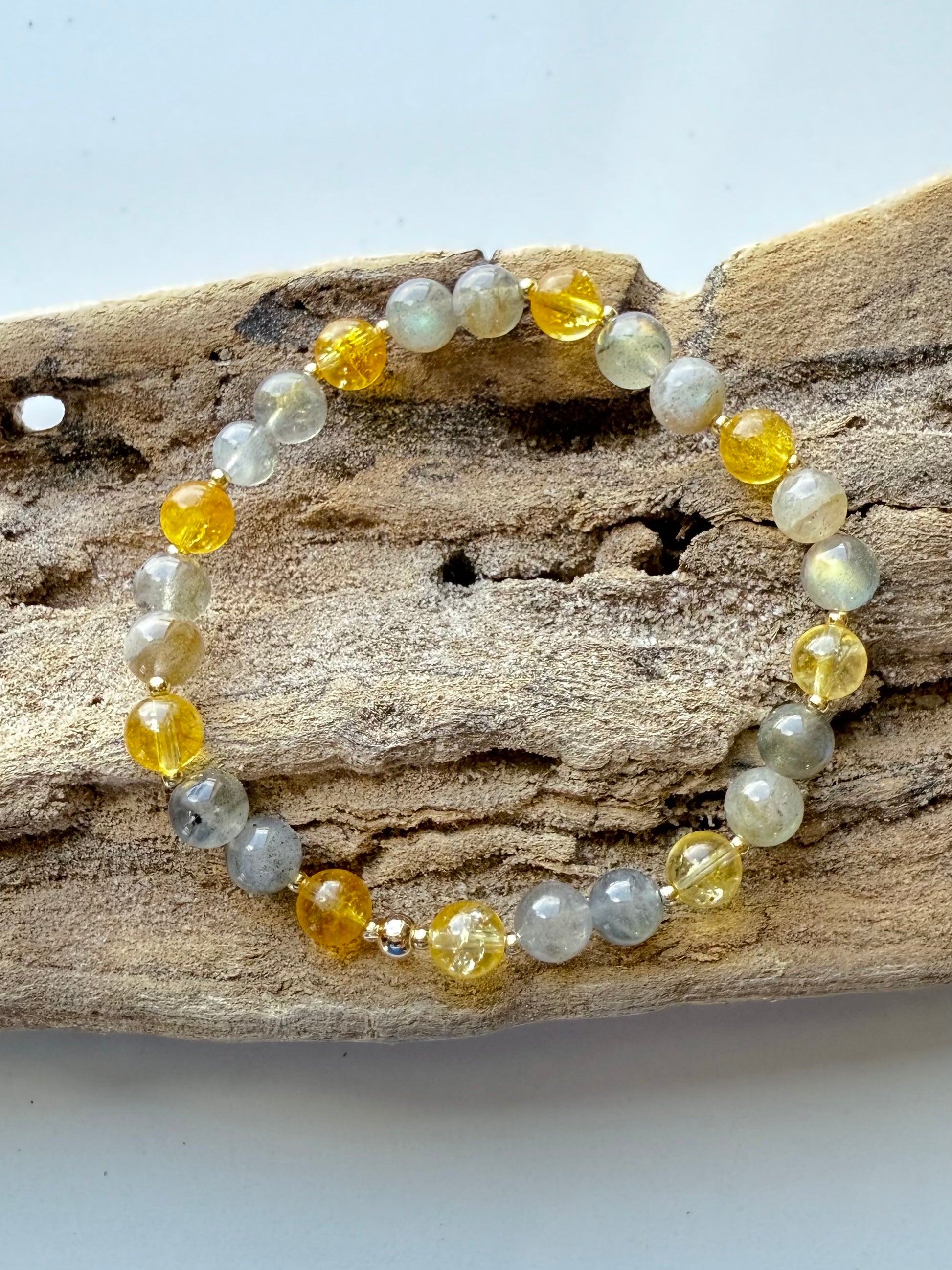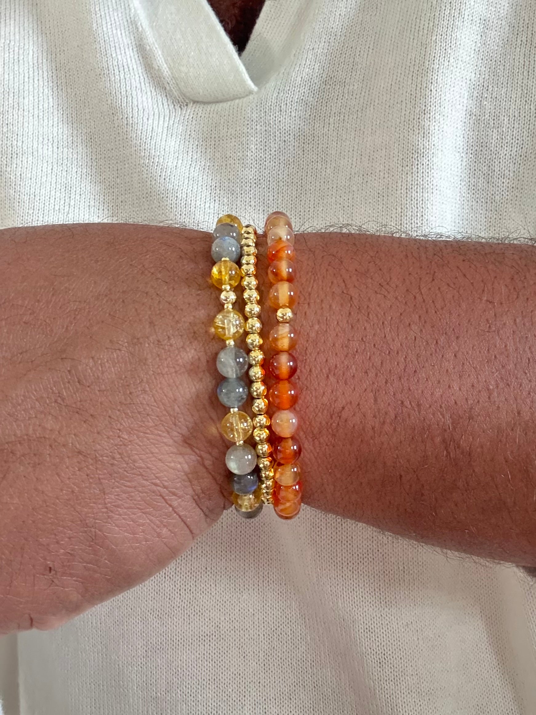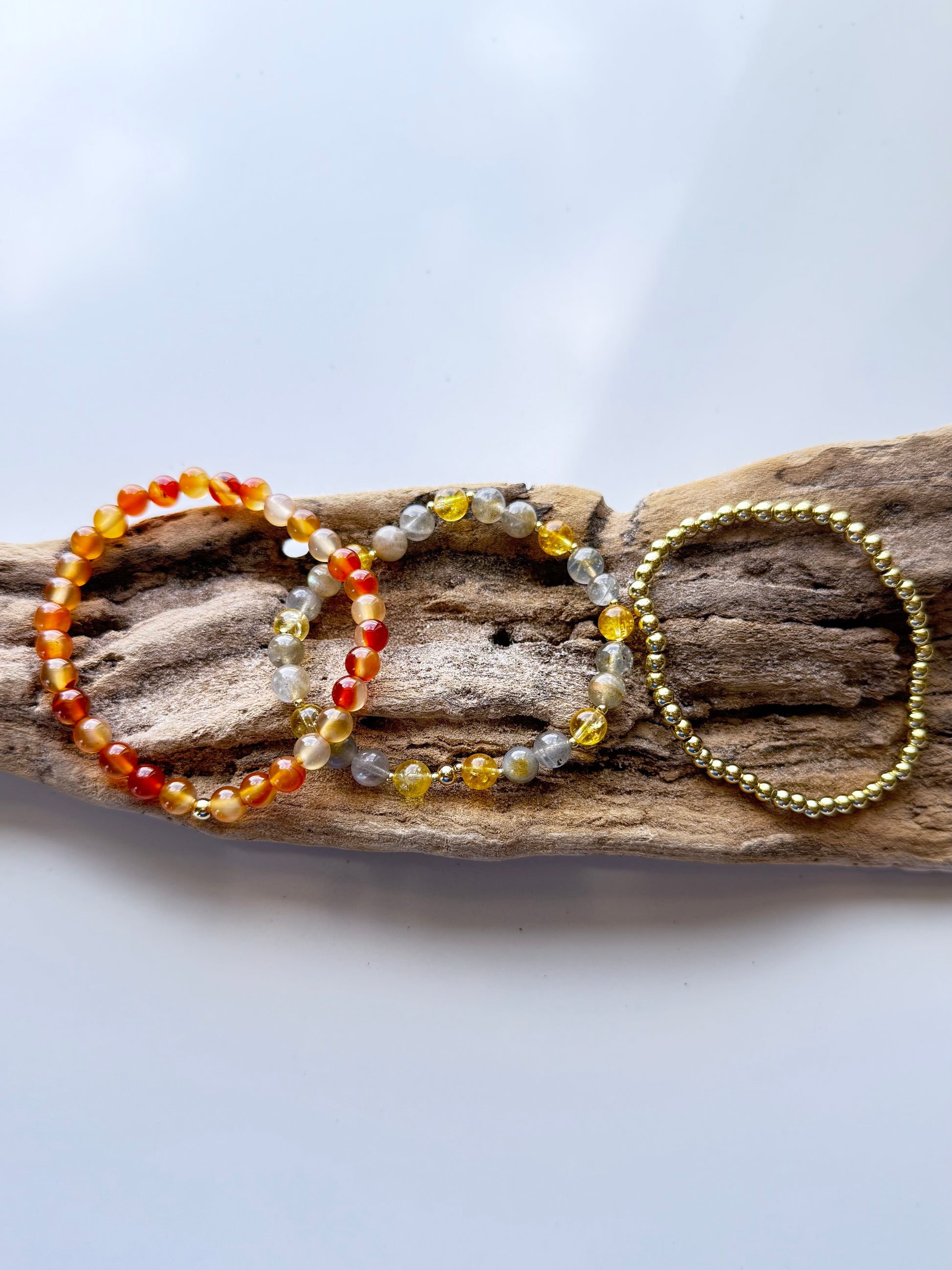 The Golden Hour Stack captures that rare moment of light right before sunset — warm, alive, and effortless. Featuring luminous citrine and gray labradorite for balance and clarity, a strand of radiant gold-filled beads for timeless polish, and fiery carnelian for confidence and passion. Wear it when you want to glow without trying. 6.5"