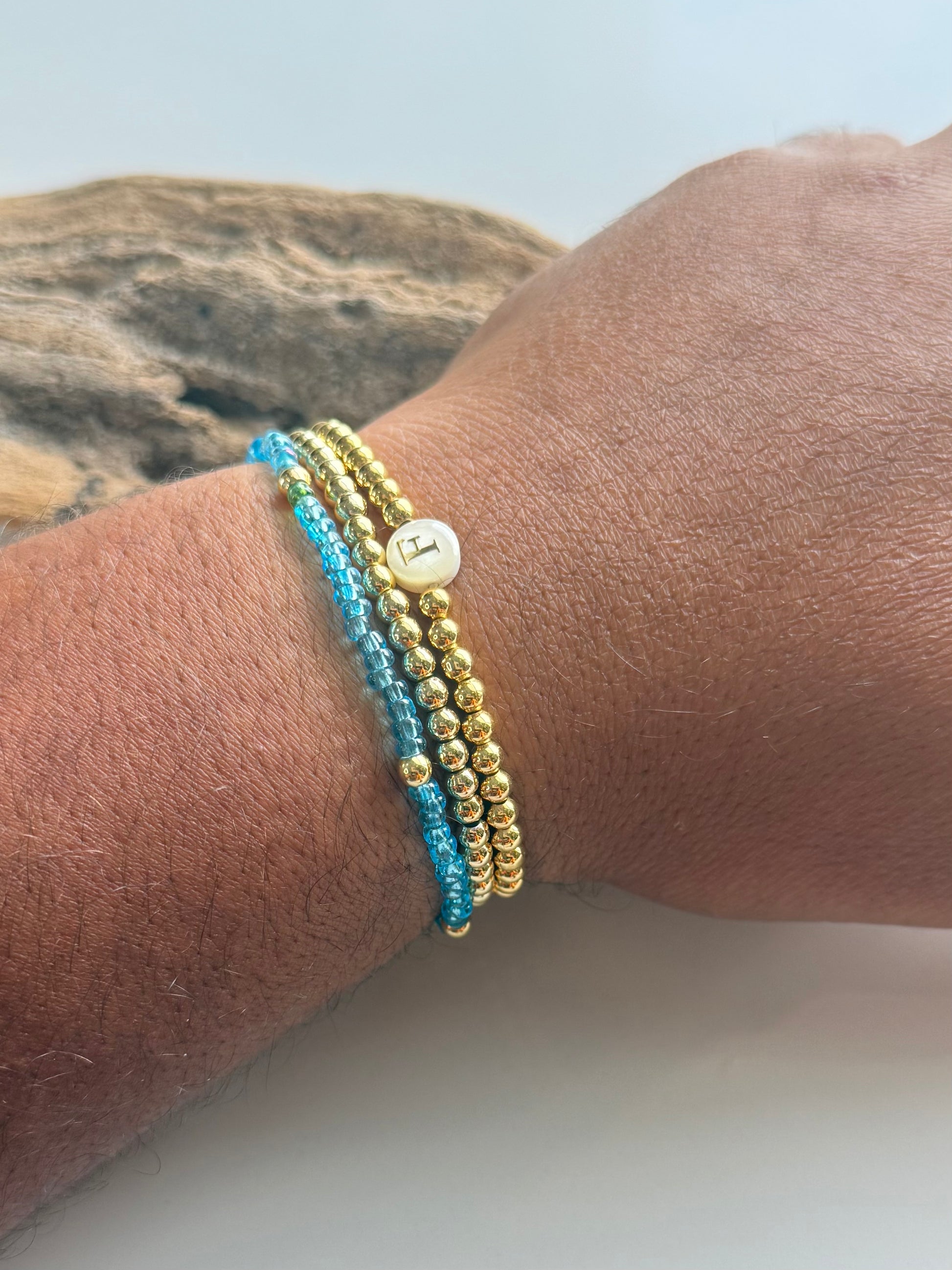 A classic made personal. This bracelet is crafted with radiant 18kt gold-filled beads that will not tarnish, ensuring it keeps its brilliance for years to come. At the center, a luminous mother of pearl bead features a hand-stamped letter of your choice—because your jewelry should be as individual as you are.