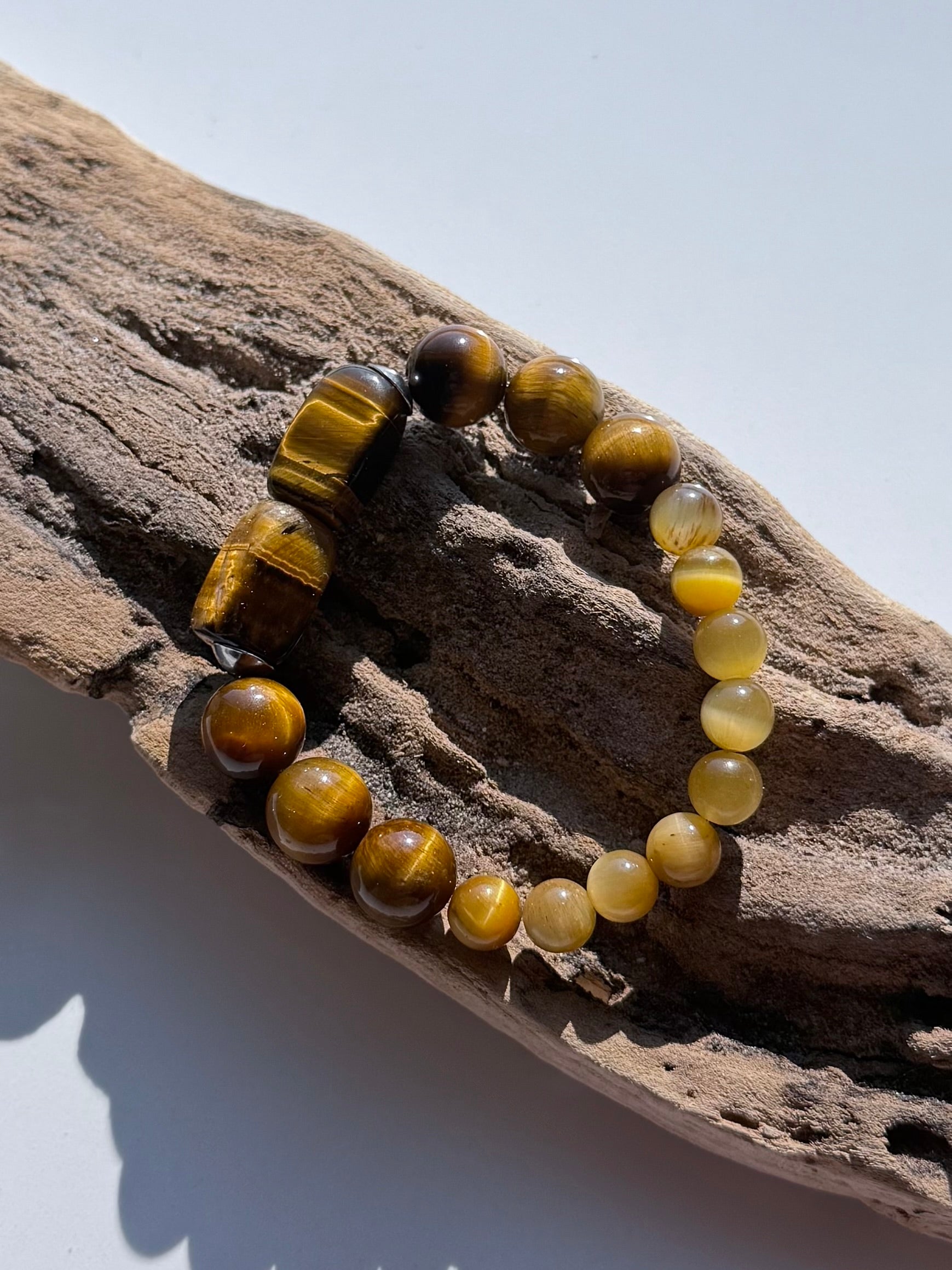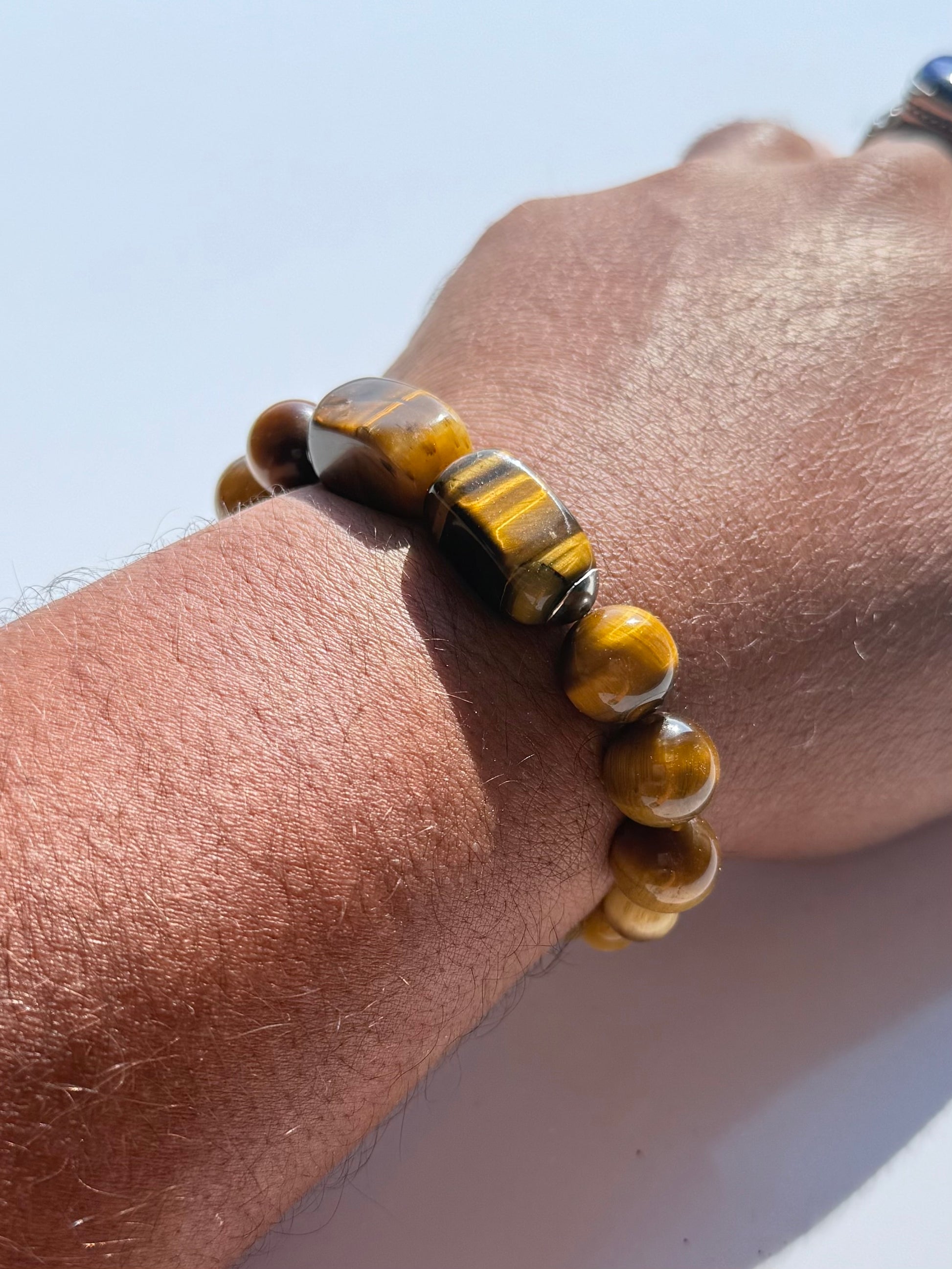 A mix of 8–12mm tiger eye beads, grounded and radiant with golden depth. Anchored by bold 15x8mm rectangular accents that catch the light like polished amber. Strung on durable elastic cord for strength and comfort. Confident, earthy, and unmistakably powerful—this one’s pure presence.