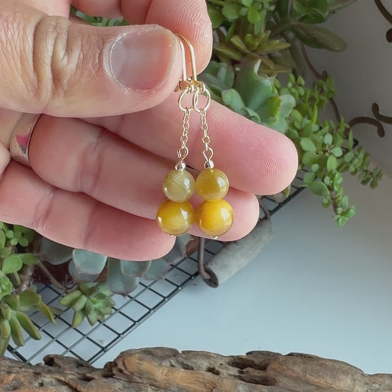 A refined double-drop earring featuring natural golden tiger eye, selected for its warmth, depth, and subtle movement. Each stone is suspended from a delicate gold-filled chain and finished with gold-filled leverback closures for comfort, balance, and everyday wear.