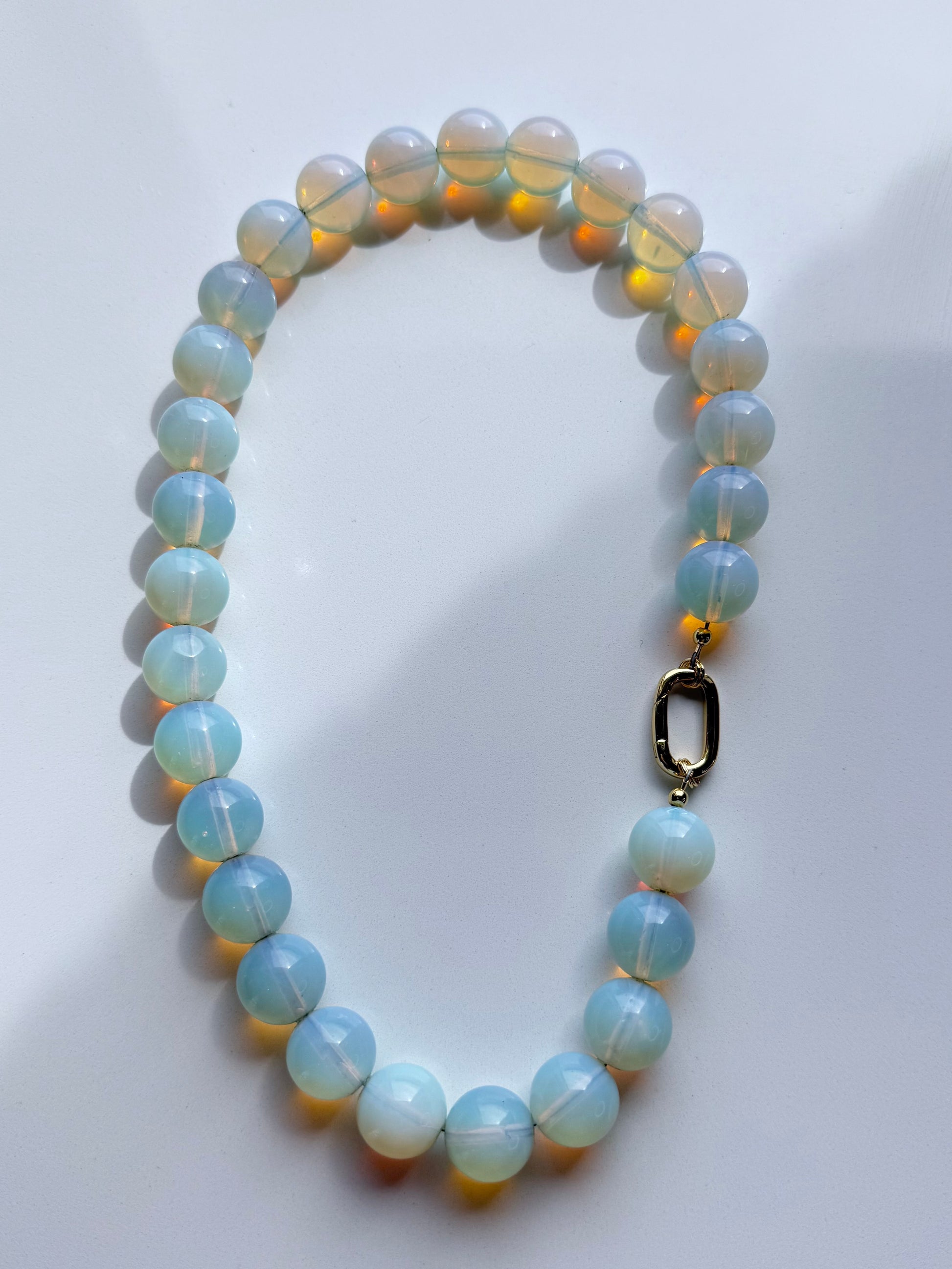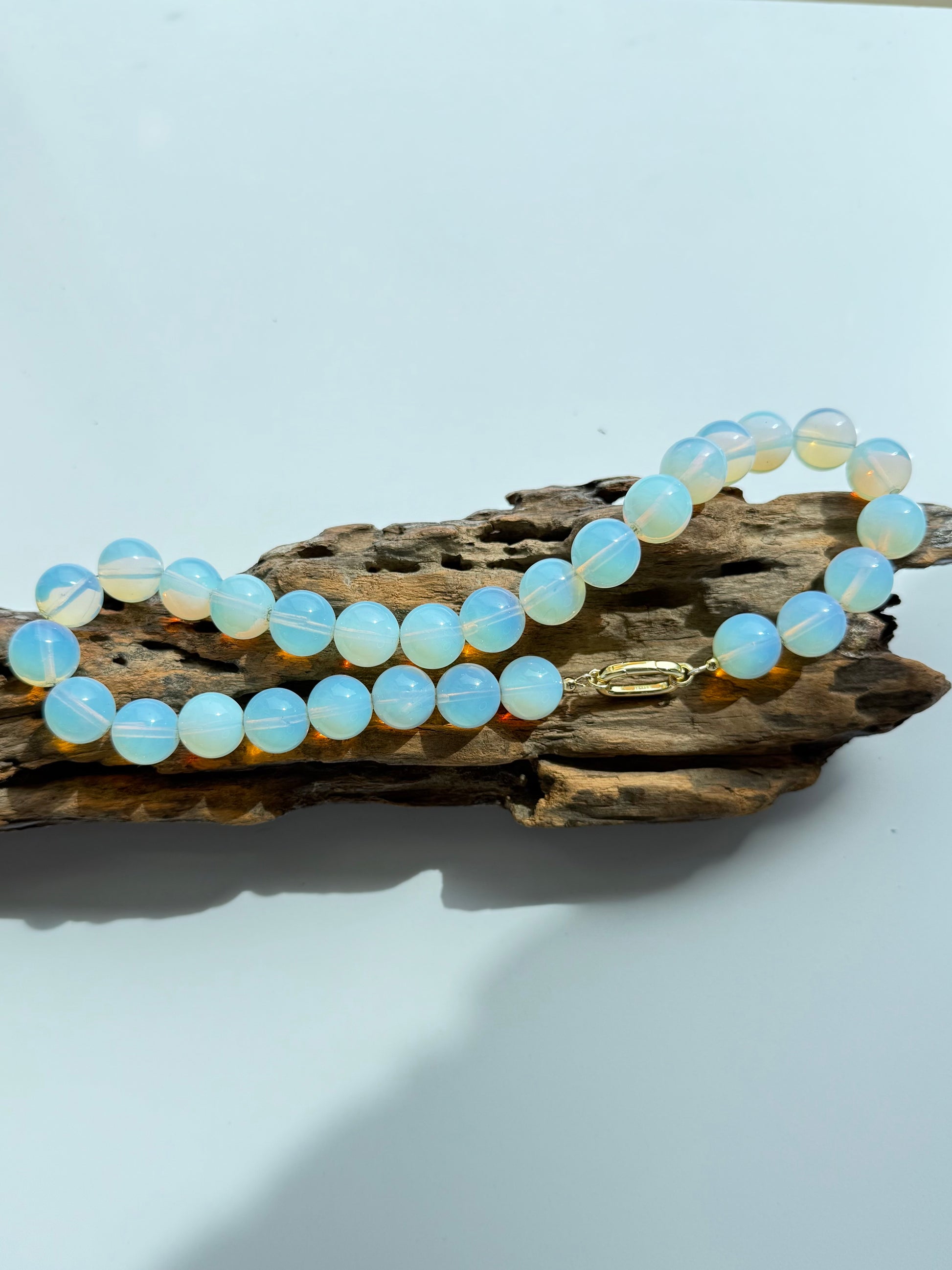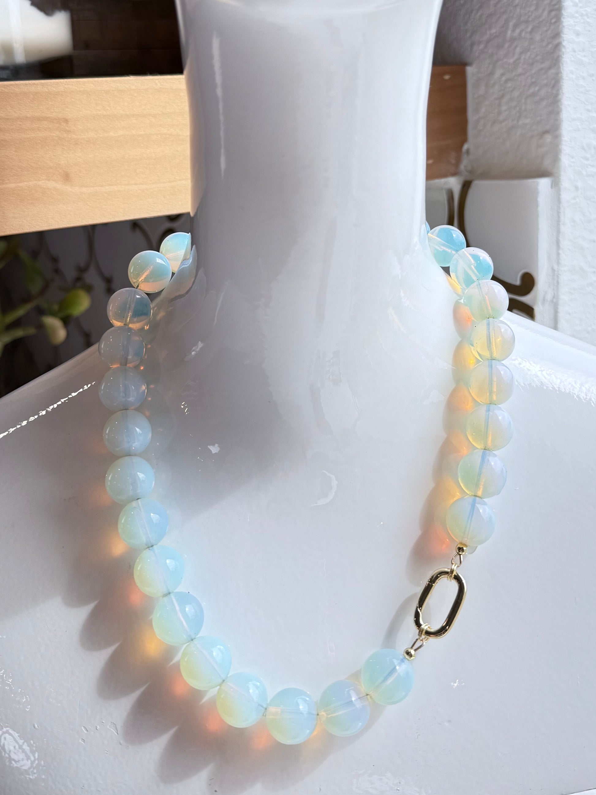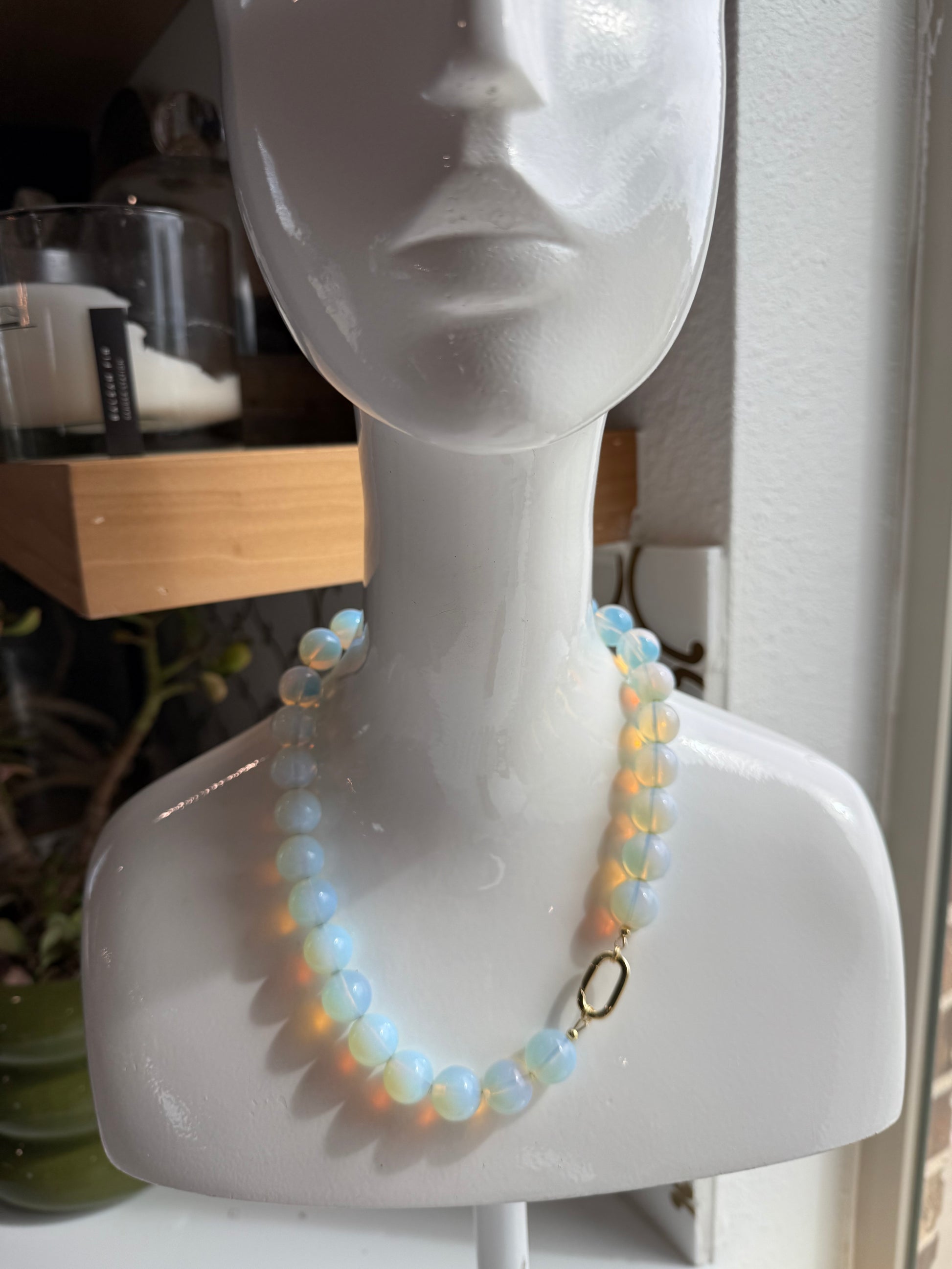 Smooth 15mm opalite beads shimmer with a milky glow that shifts with the light—equal parts ethereal and striking. Finished with 14k gold-filled accents that never tarnish, this piece turns a simple neckline into a statement. Designed for women who believe jewelry should enchant as much as it adorns.