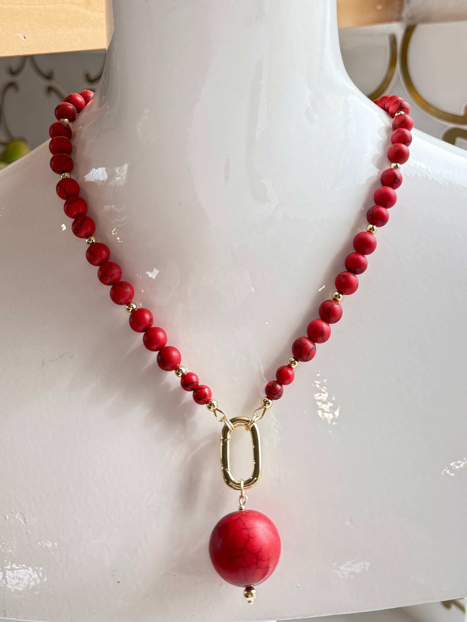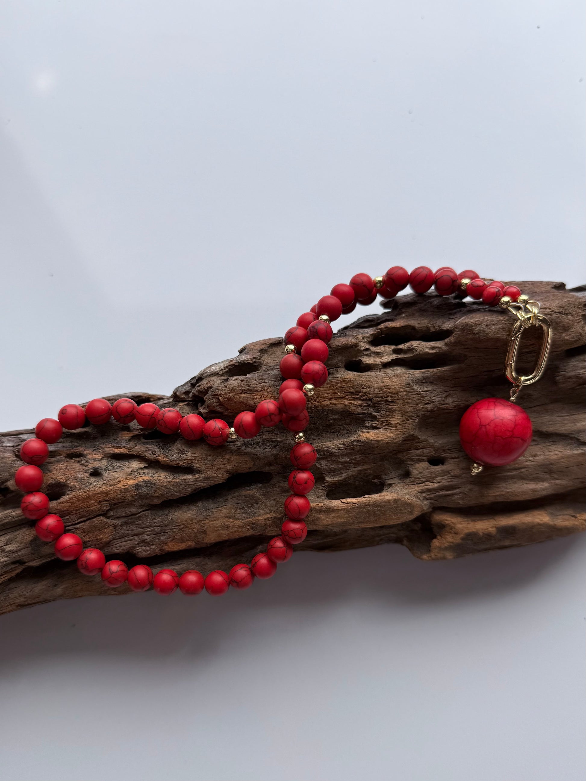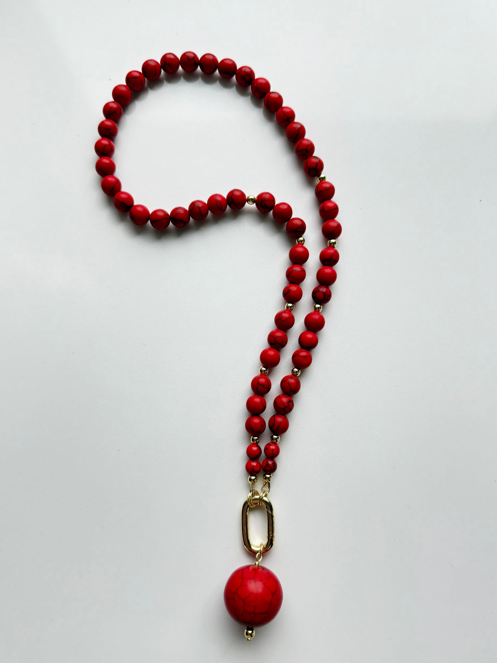 Vivid 8mm red howlite beads make a bold impression, anchored by a striking 20mm pendant. Finished with 14k gold-filled accents that never tarnish, this necklace was designed for women who know confidence isn’t optional—it’s required.
