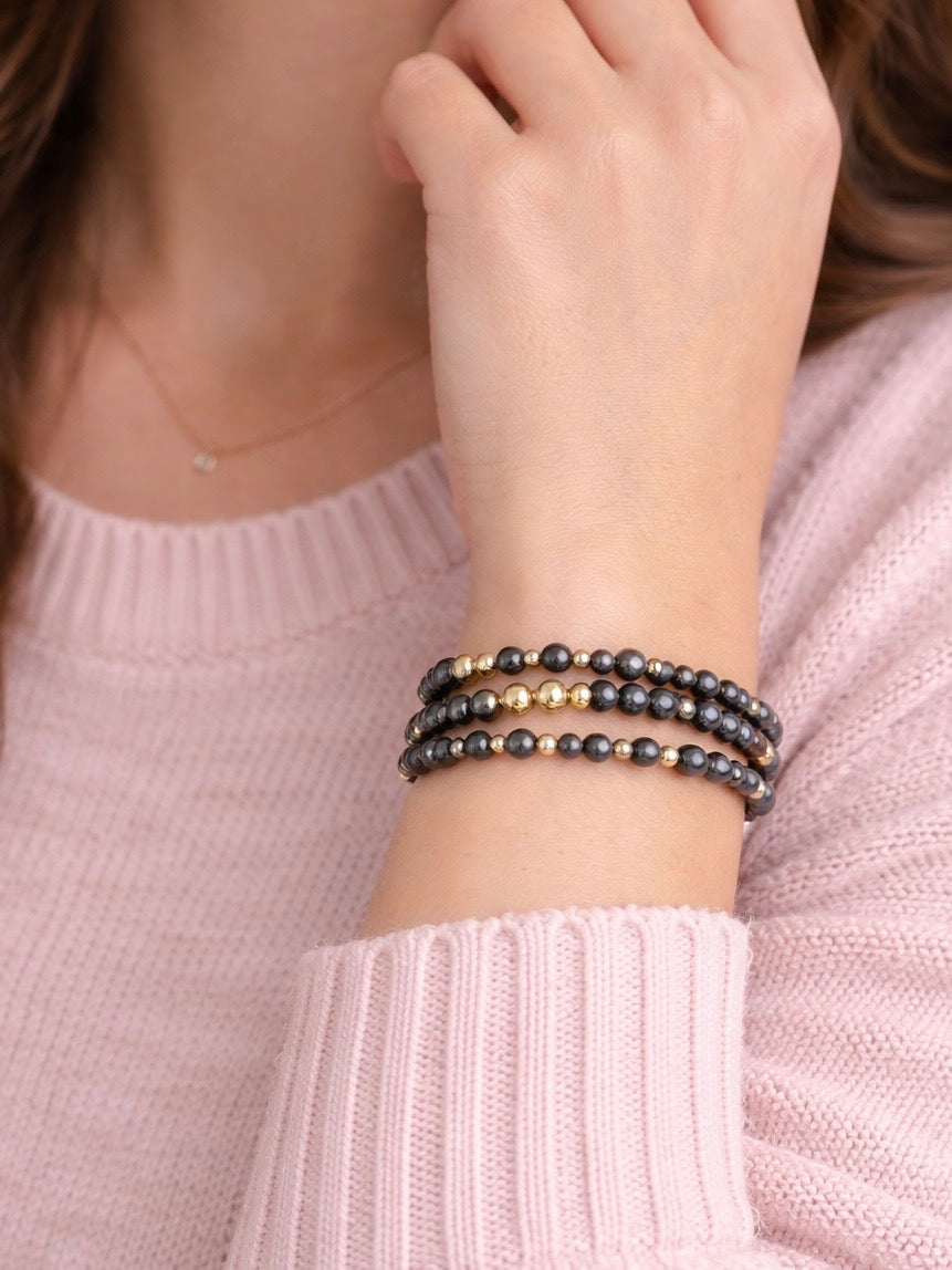 Each bracelet in the stack varies slightly in bead size, creating subtle dimension while remaining cohesive and easy to wear.