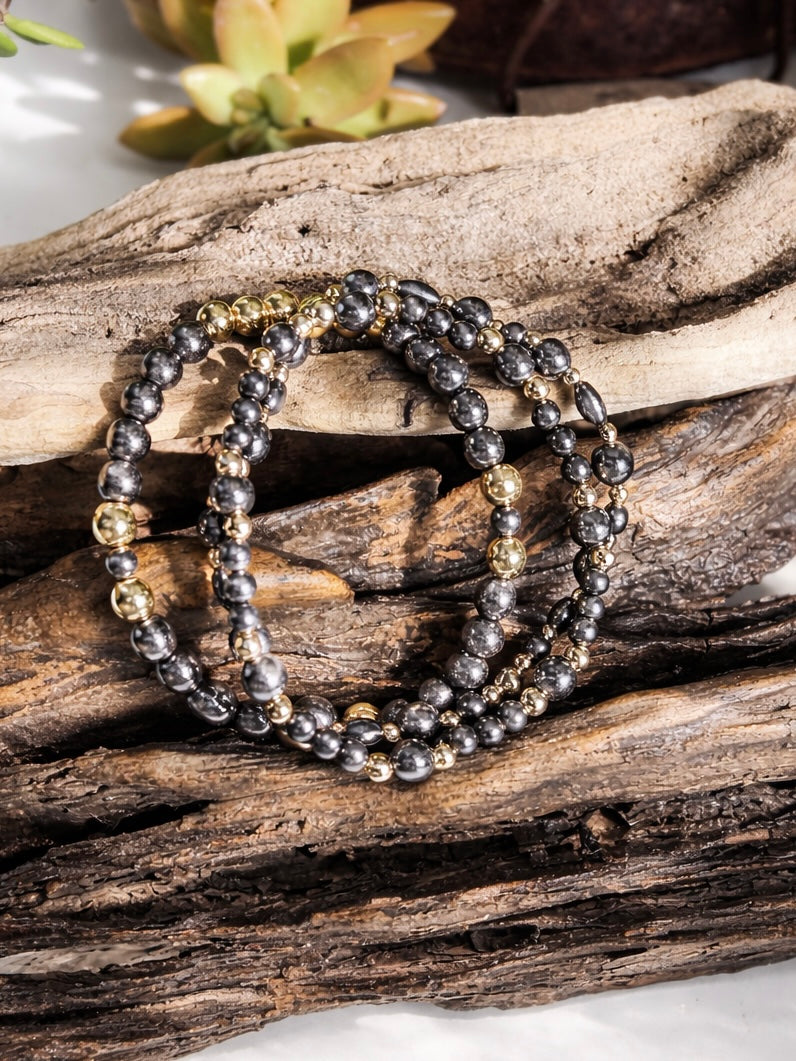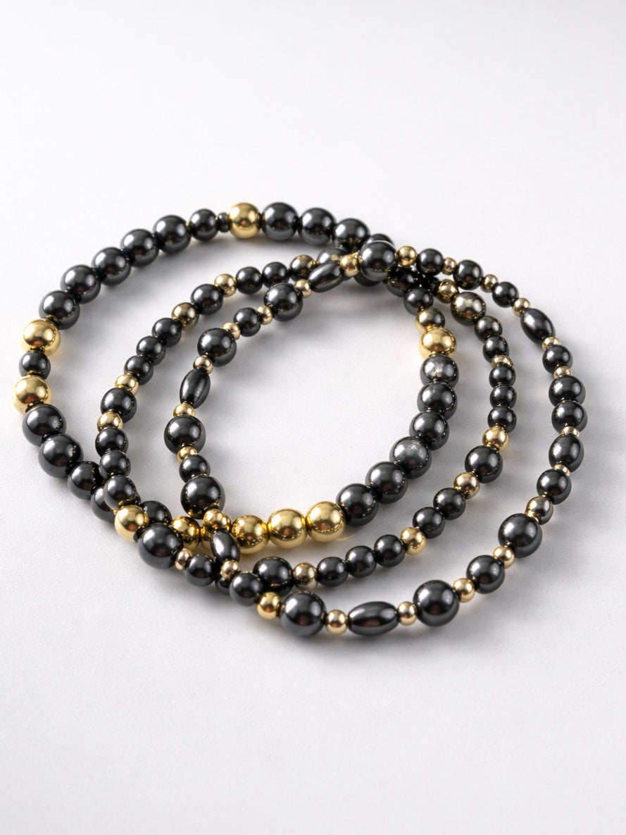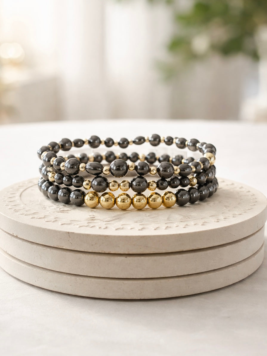 A thoughtfully designed bracelet stack featuring Hematite, chosen for its rich, reflective depth and naturally weighted feel. Designed to be worn daily — together or separately — this three-bracelet set offers a clean, grounded look with quiet strength and modern polish.