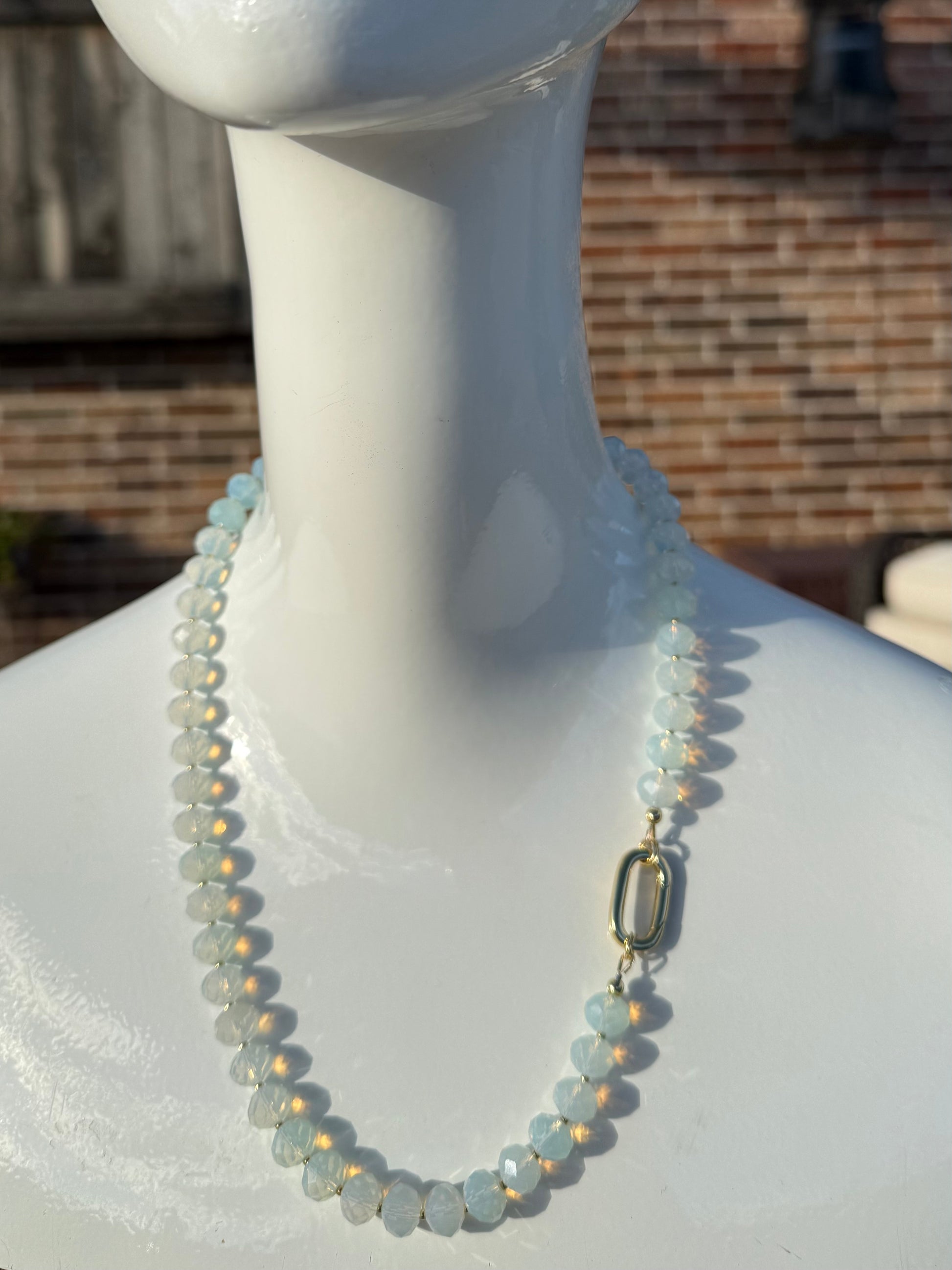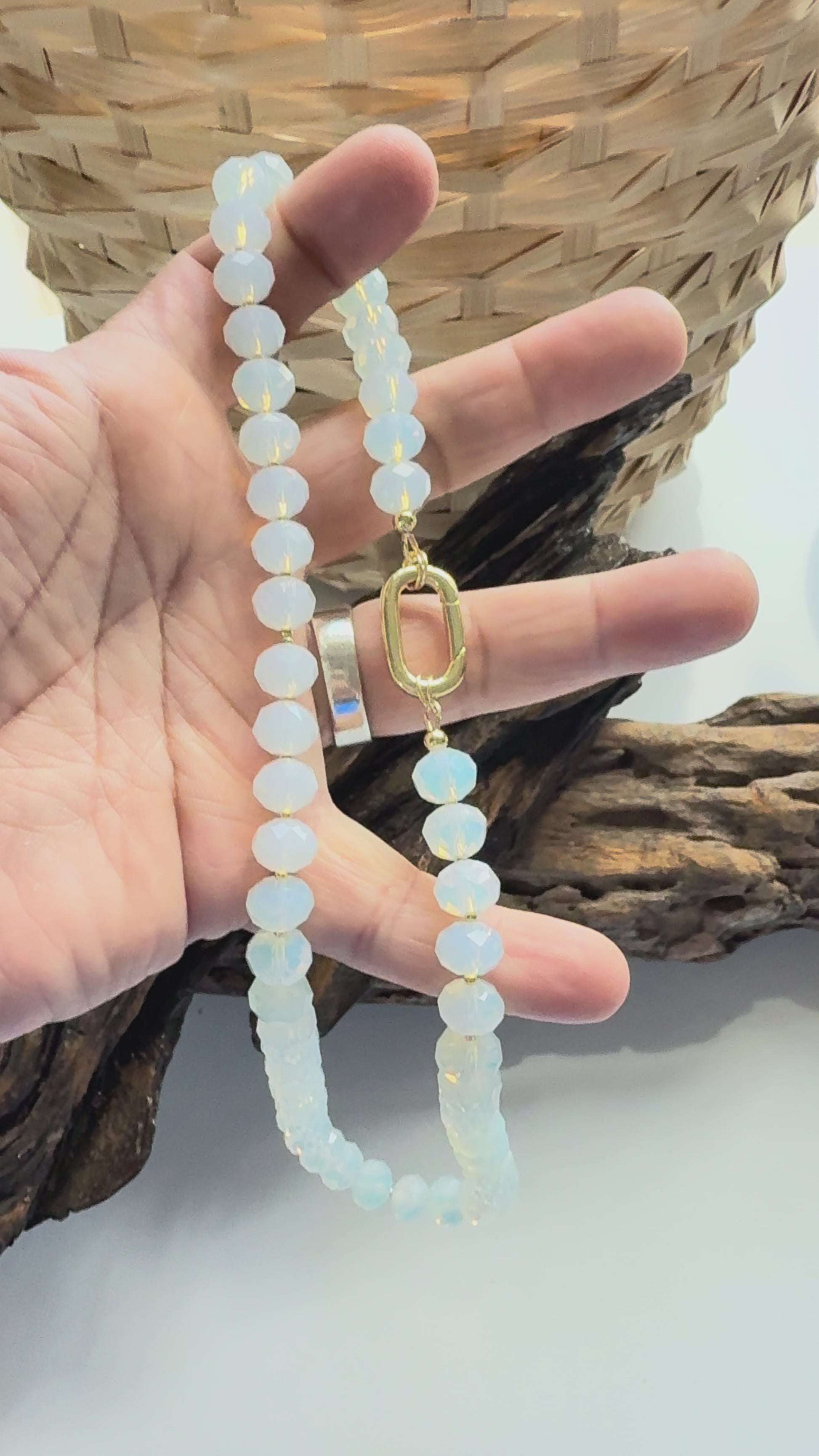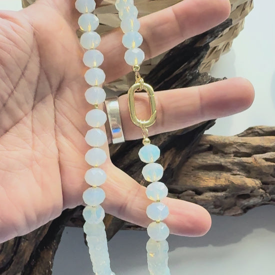 A 20” strand of luminous opalite beads that seem to hold their own light. Each faceted stone shifts from milky white to soft blue, catching a gentle glow with every move. Accented with 14k gold-filled details and finished with a sleek gold clasp, this piece radiates understated elegance.