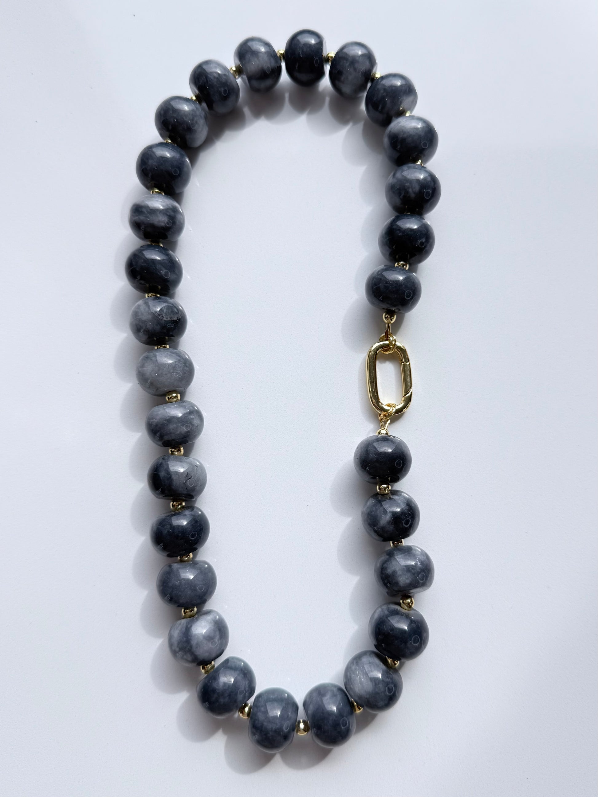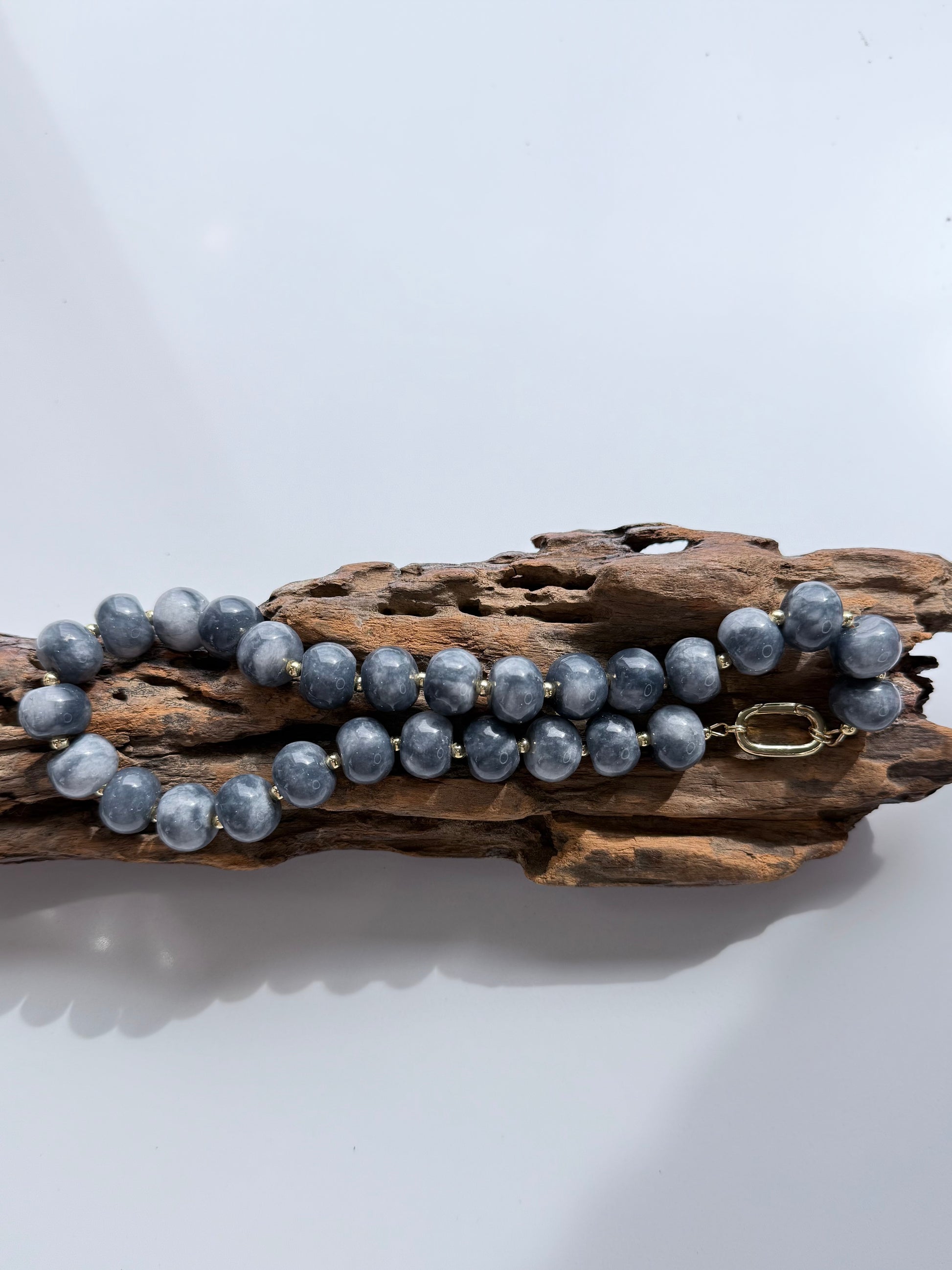 Meet the Monaco a piece that proves simplicity can still make a statement. Smooth, natural sodalite gemstones in deep ocean hues are paired with radiant 14k gold-filled beads, creating a balance of calm confidence and quiet luxury. Each stone tells its own story—rich blues, subtle veining, and one-of-a-kind charm—making every necklace slightly different from the next. Designed to layer effortlessly or shine solo, this piece captures the ease of refined style with a touch of modern edge. 17.5"