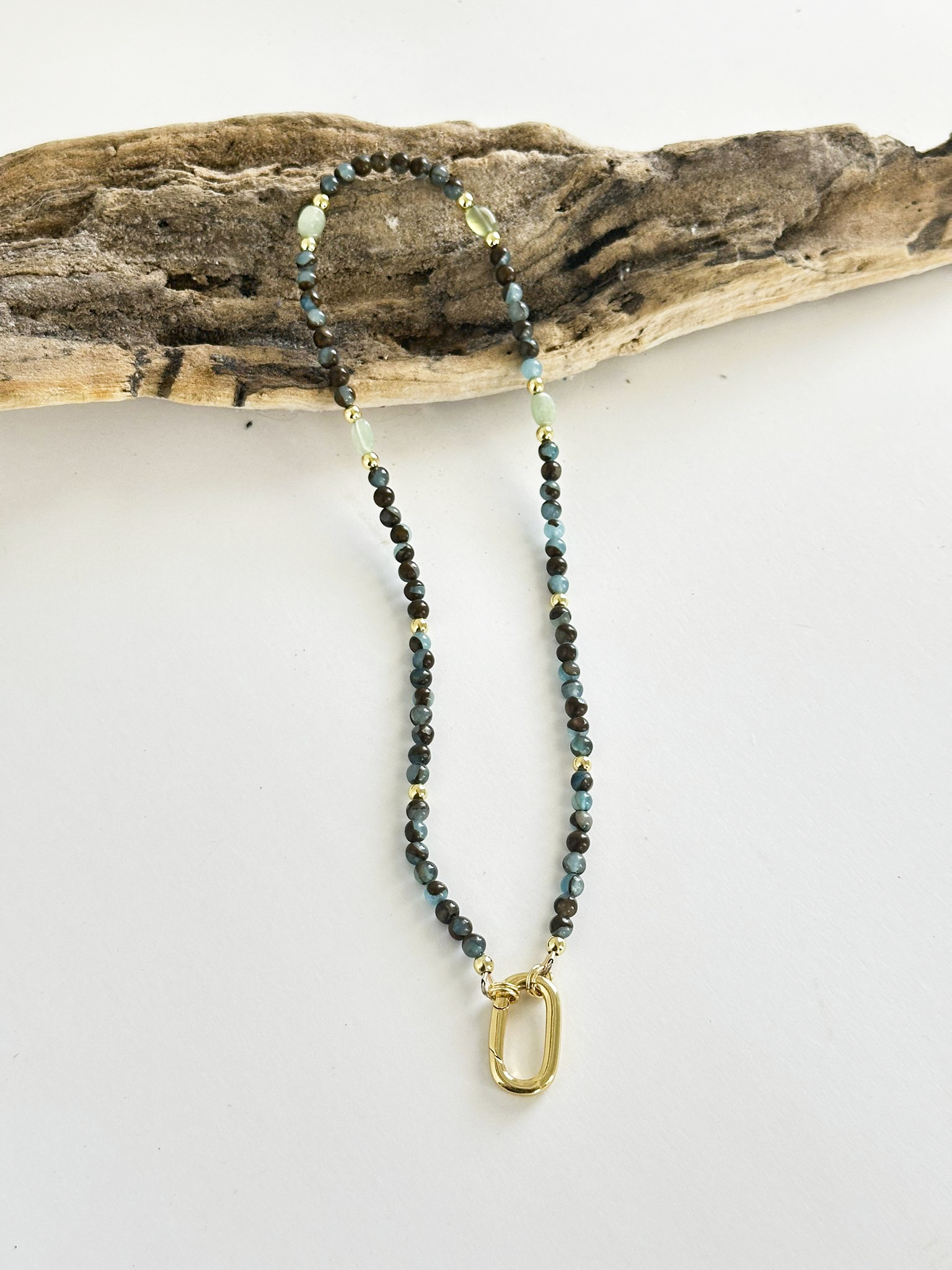 Rich earthy tones and vibrant teal beads come together with golden accents and a striking carabiner clasp. Inspired by quiet woodland trails and dappled sunlight, this piece blends nature’s tranquility with modern edge — perfect worn solo or layered.