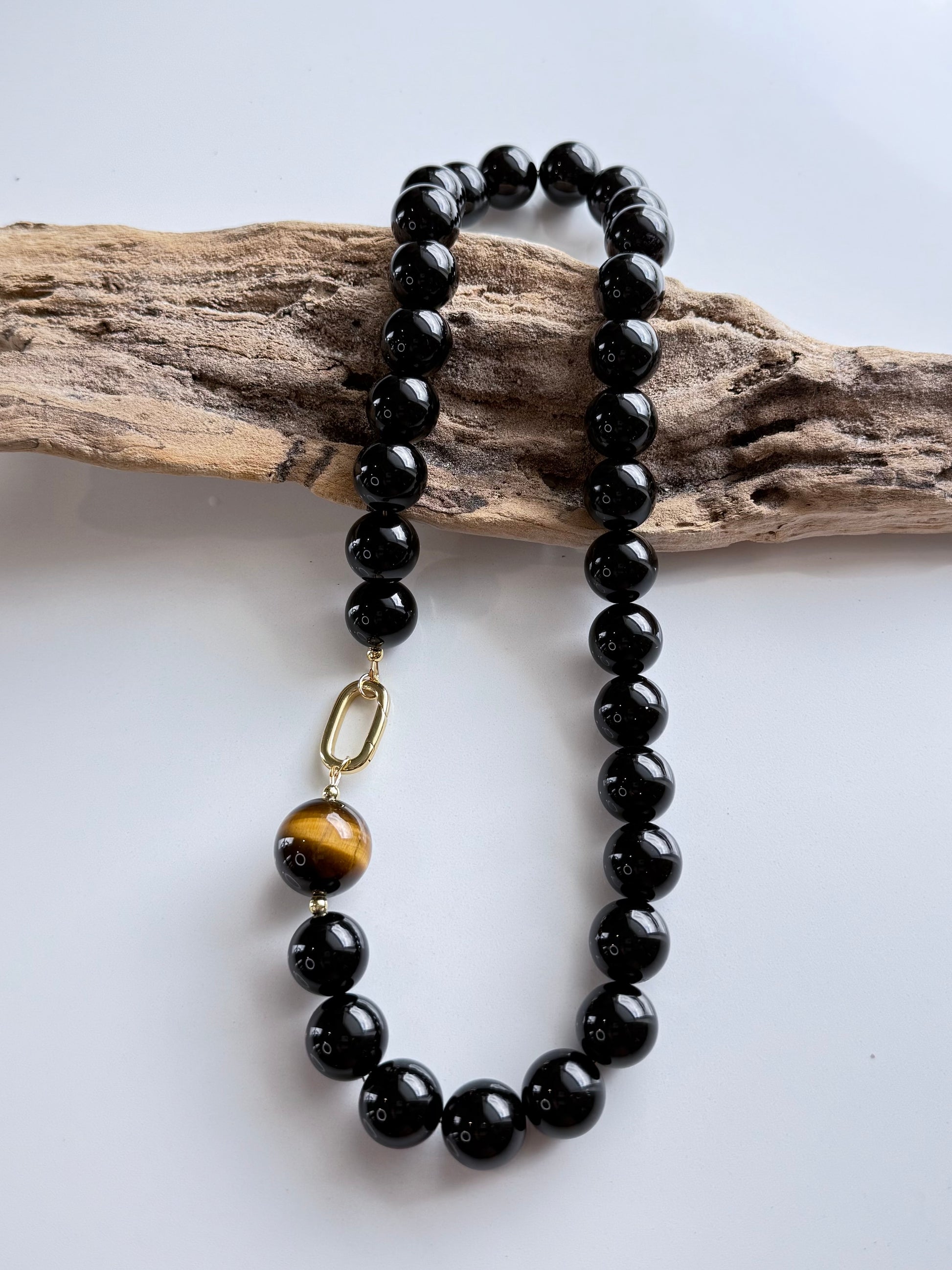 Hand-strung with 15mm AAA Black Onyx beads, this necklace carries a striking depth and mirror-like polish. At it’s heart sits a 20mm AAA++ Tiger Eye gemstone, rich with golden striations that catch the light and demand a second look. The design is finished with a solid 14kt gold-filled finding, bringing just the right amount of radiance and sophistication.