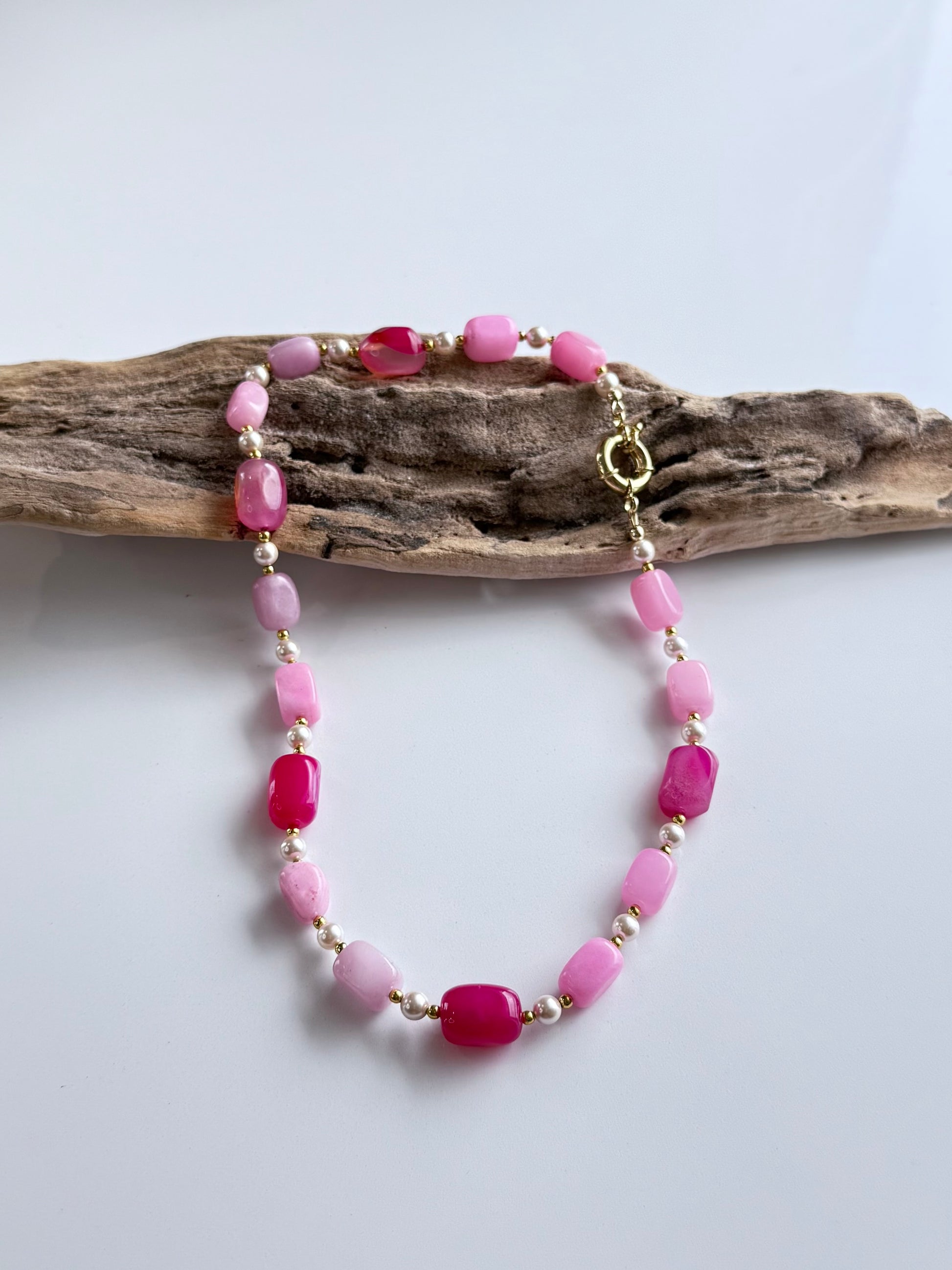 Feminine yet bold, The Rosaria Necklace is a radiant celebration of pink. At 20 inches, this piece is hand-strung with polished pink agate gemstones in shades ranging from blush to vivid fuchsia, each bead unique in its tone and depth.