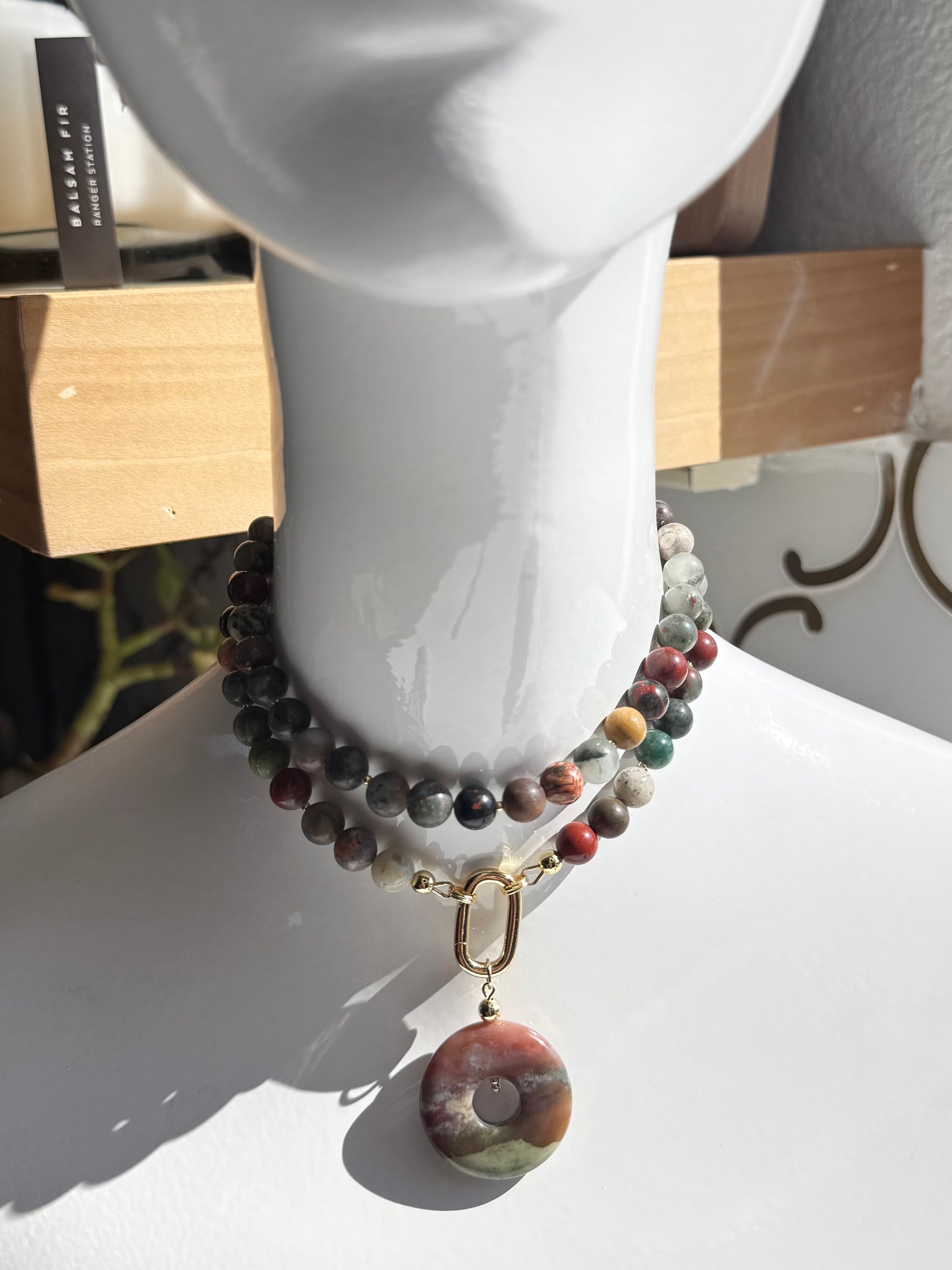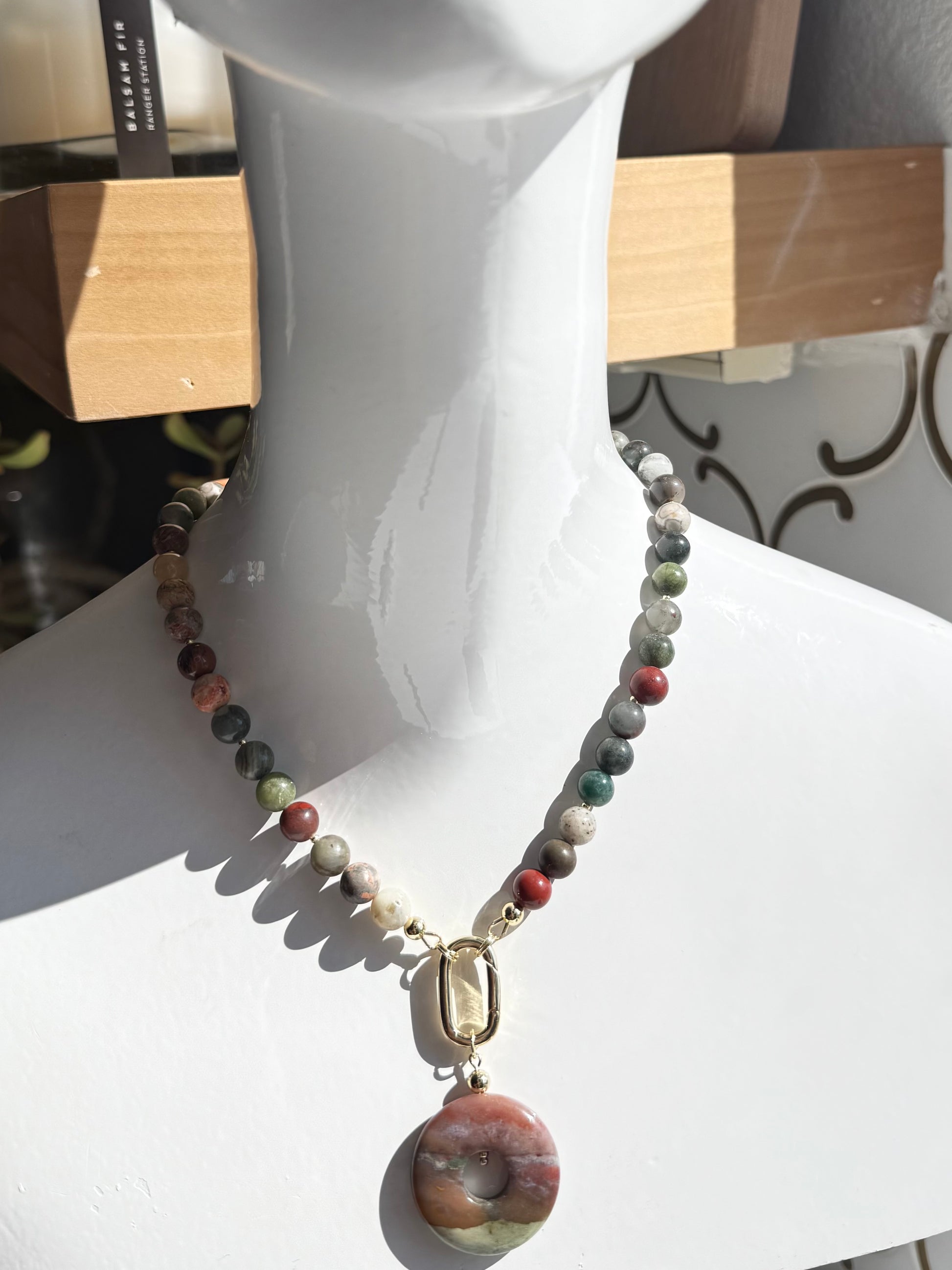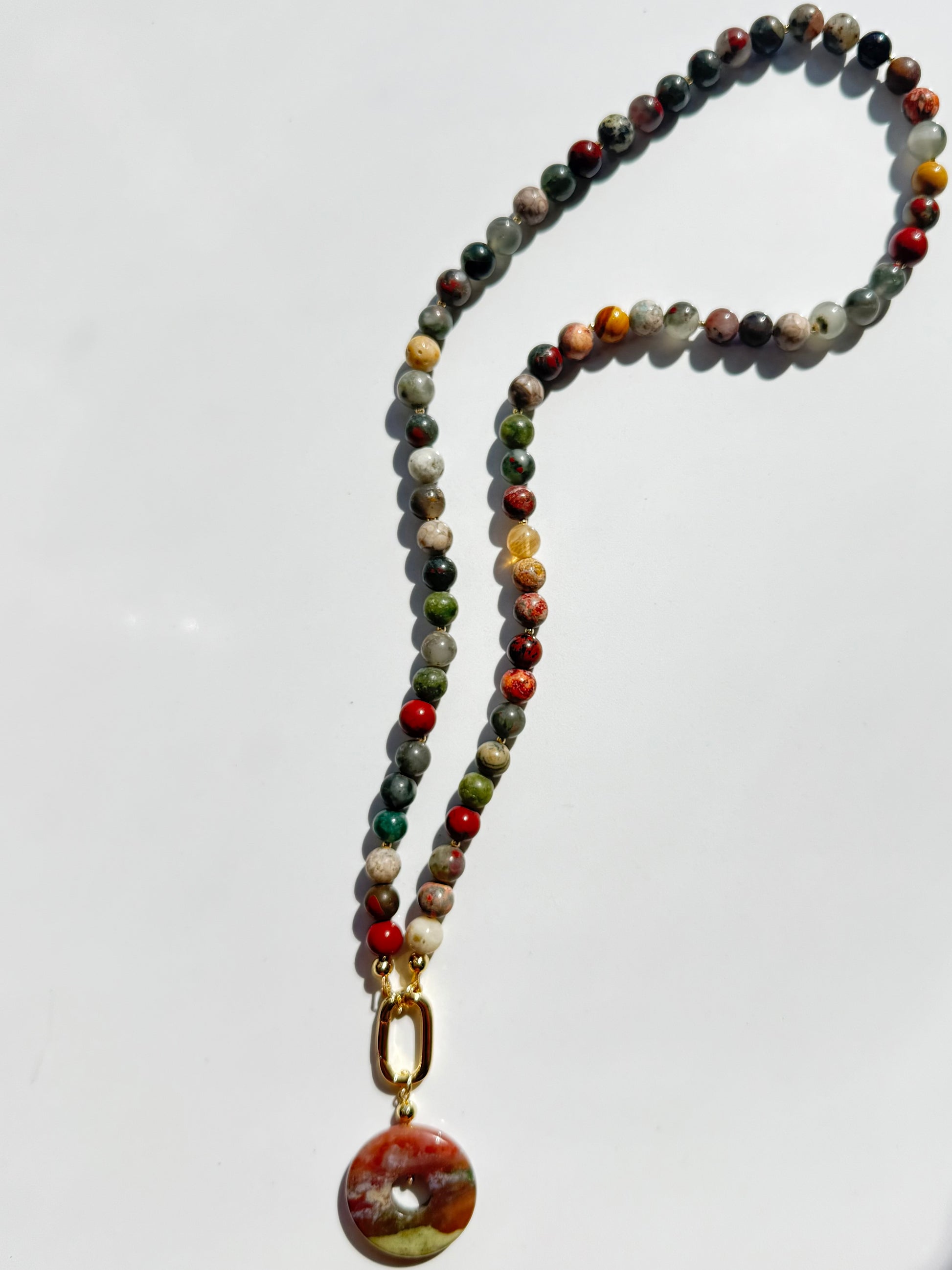 Inspired by the wild beauty of the Southwest, The Sedona Necklace is a vibrant celebration of color, earth, and artistry. Hand-strung with natural multicolor jasper gemstones, each bead reveals its own landscape of reds, greens, ambers, and neutrals—no two alike. A polished gold-filled link and a stunning stone donut pendant create a bold focal point that feels both grounded and refined.