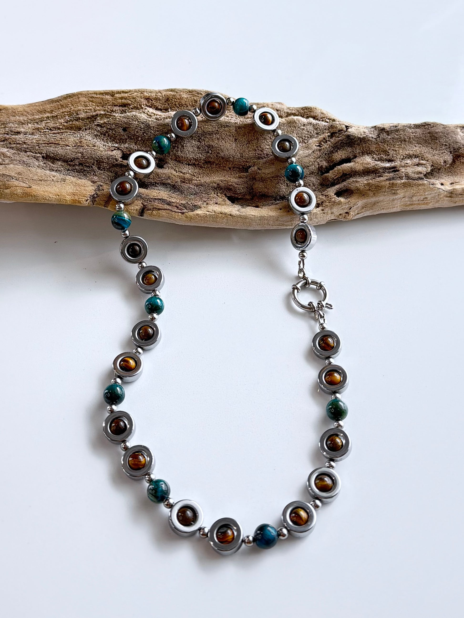 Each link alternates between 10mm hematite frames set with 6mm golden-brown Tiger Eye and polished blue Tiger Eye beads, giving the piece dimension and movement. The stainless steel findings add durability and a modern edge, ensuring this necklace is as strong as it looks.