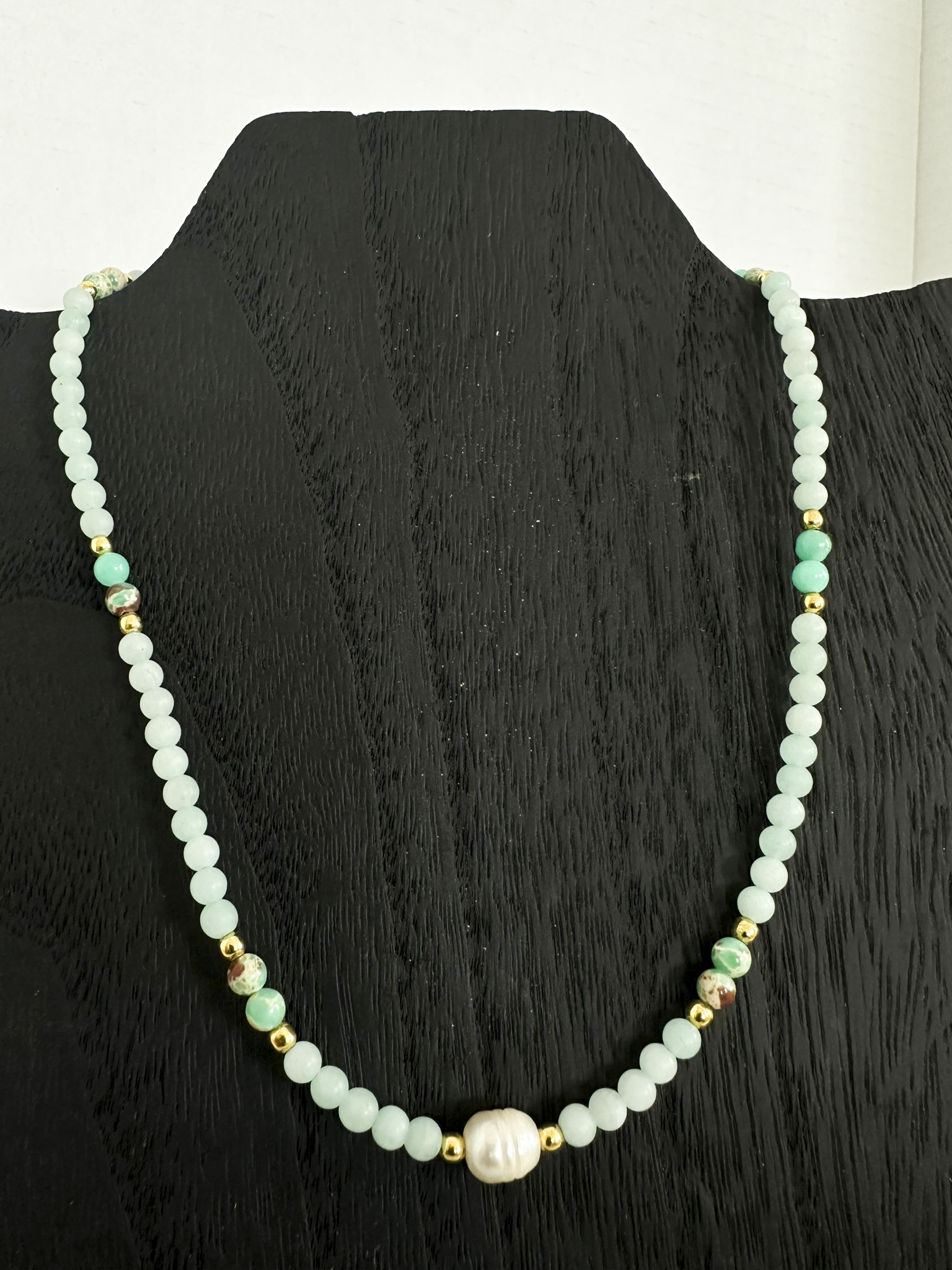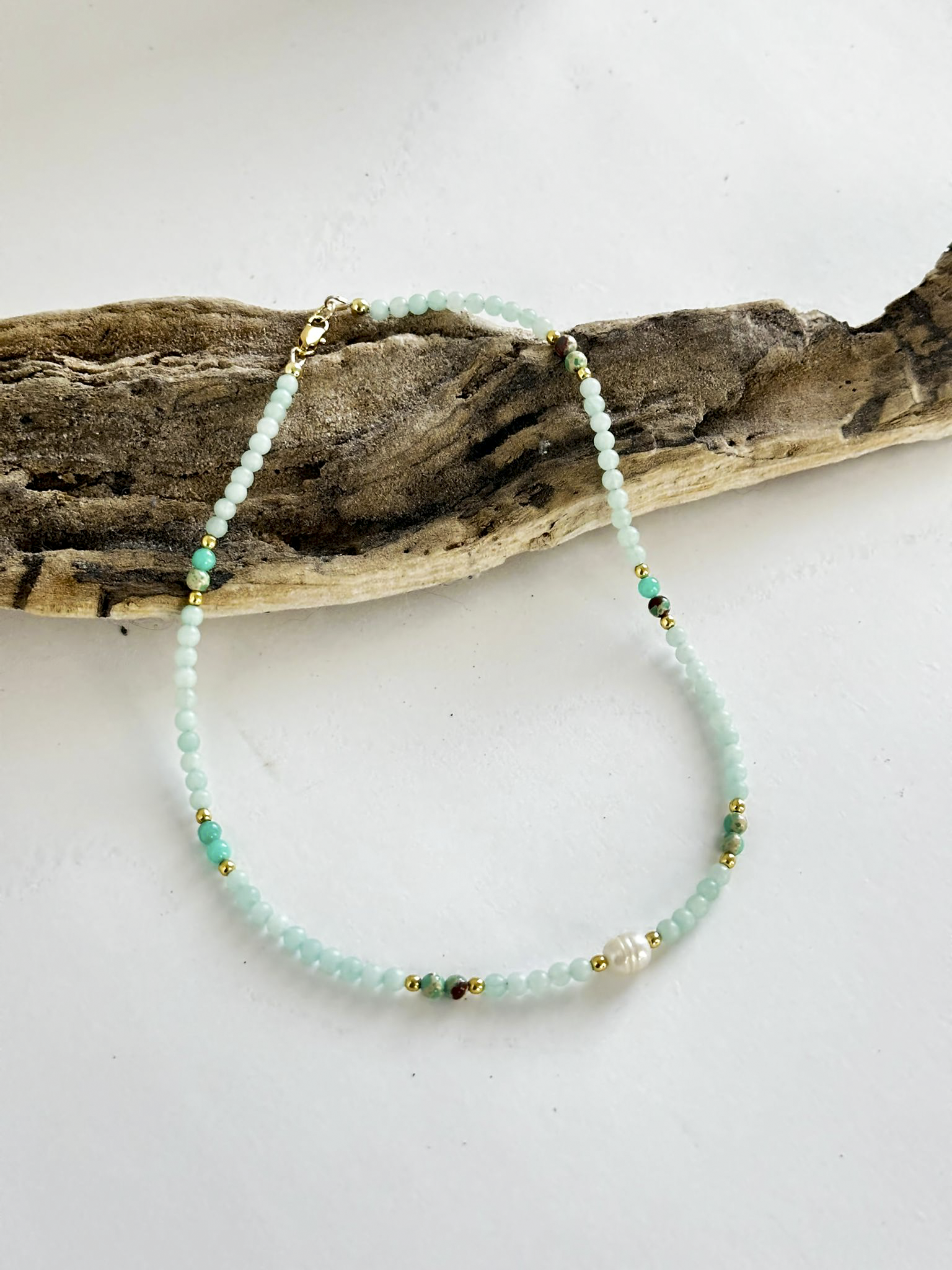 Delicate 4mm green aventurine beads flow gracefully into a luminous 6mm freshwater pearl centerpiece, accented by 6mm turquoise color sea sediment jasper and 18K gold-filled details. Capturing the quiet beauty of ocean foam meeting soft sand — tranquil, refreshing, and effortlessly elegant.