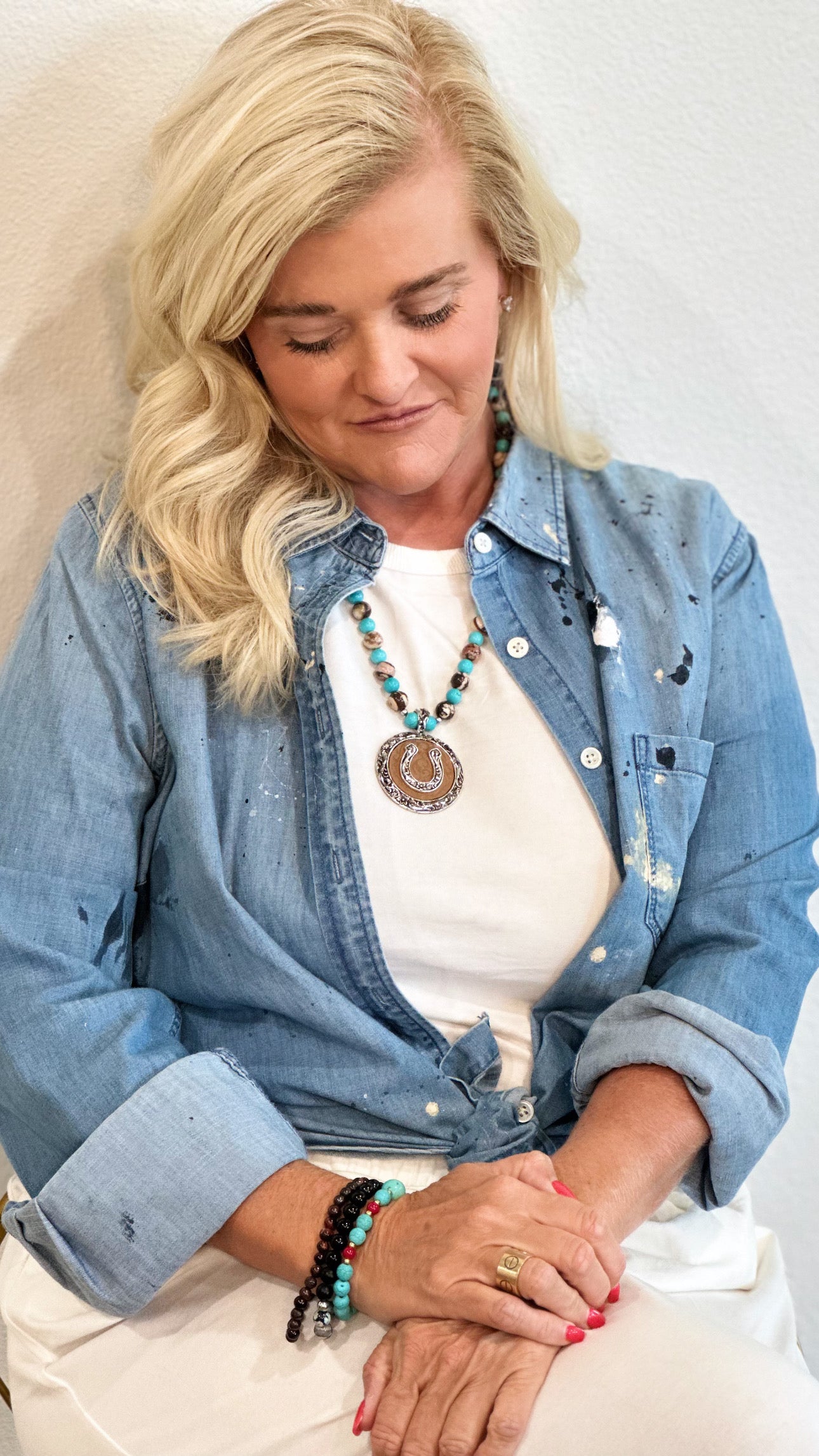 Earthy. Western. Strong. The Silverado Necklace blends the spirit of the American Southwest with timeless style. At 23 inches, it’s hand-strung with a mix of turquoise stones and earthy picture jasper beads, each carrying its own unique patterning straight from nature.