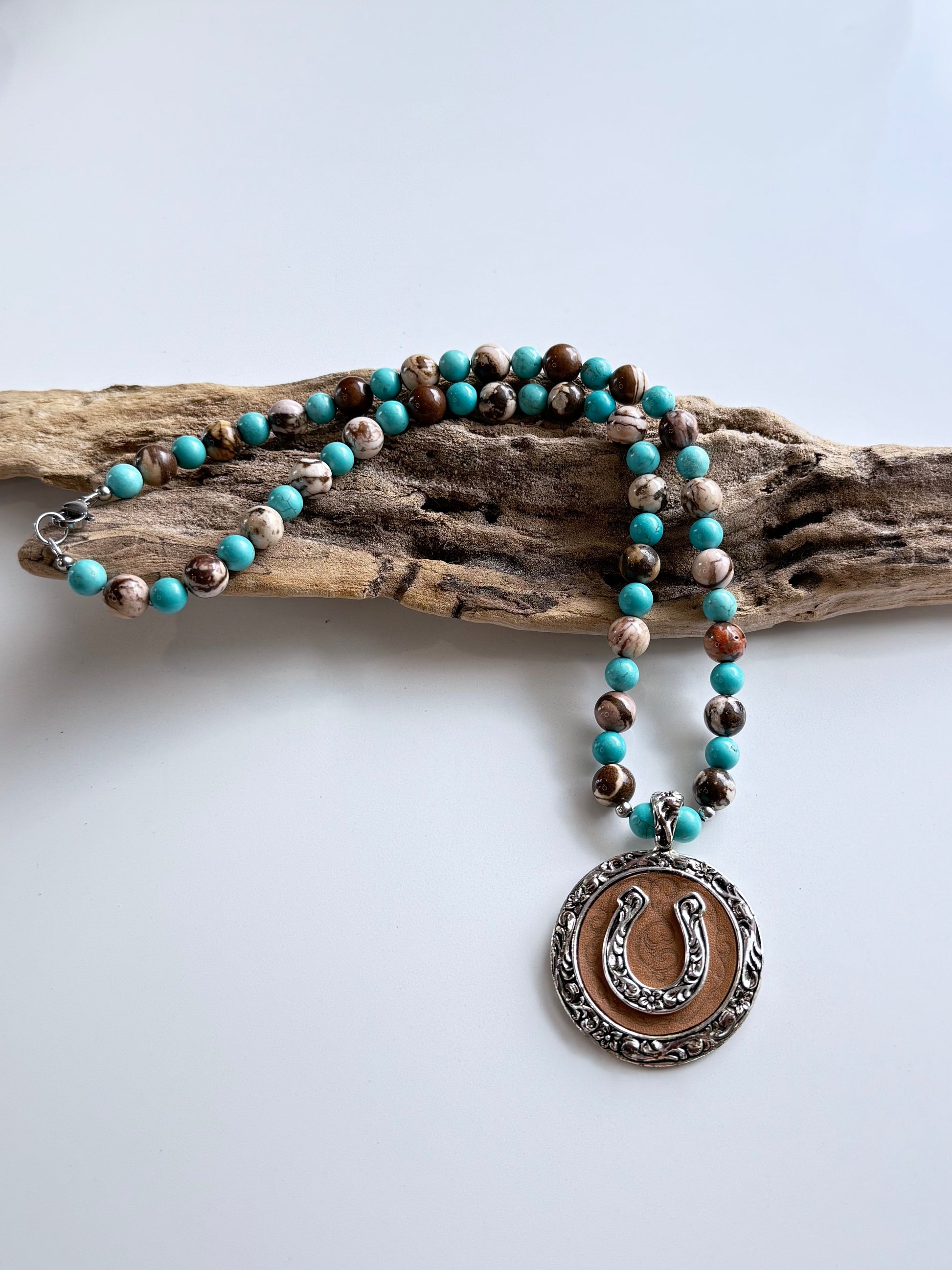 The centerpiece is a 2-inch vintage pendant, framed in silver with a raised horseshoe design—a symbol of luck, strength, and resilience.