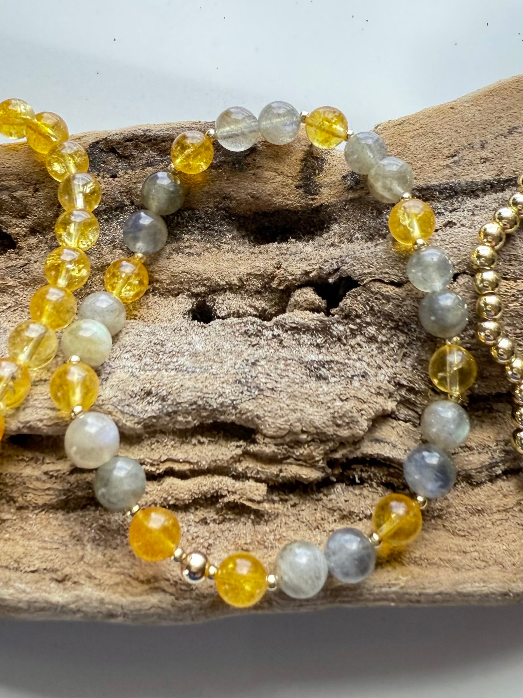 Stones: Golden Citrine radiates optimism and success, while soft gray-blue Labradorite adds quiet strength and mystery.