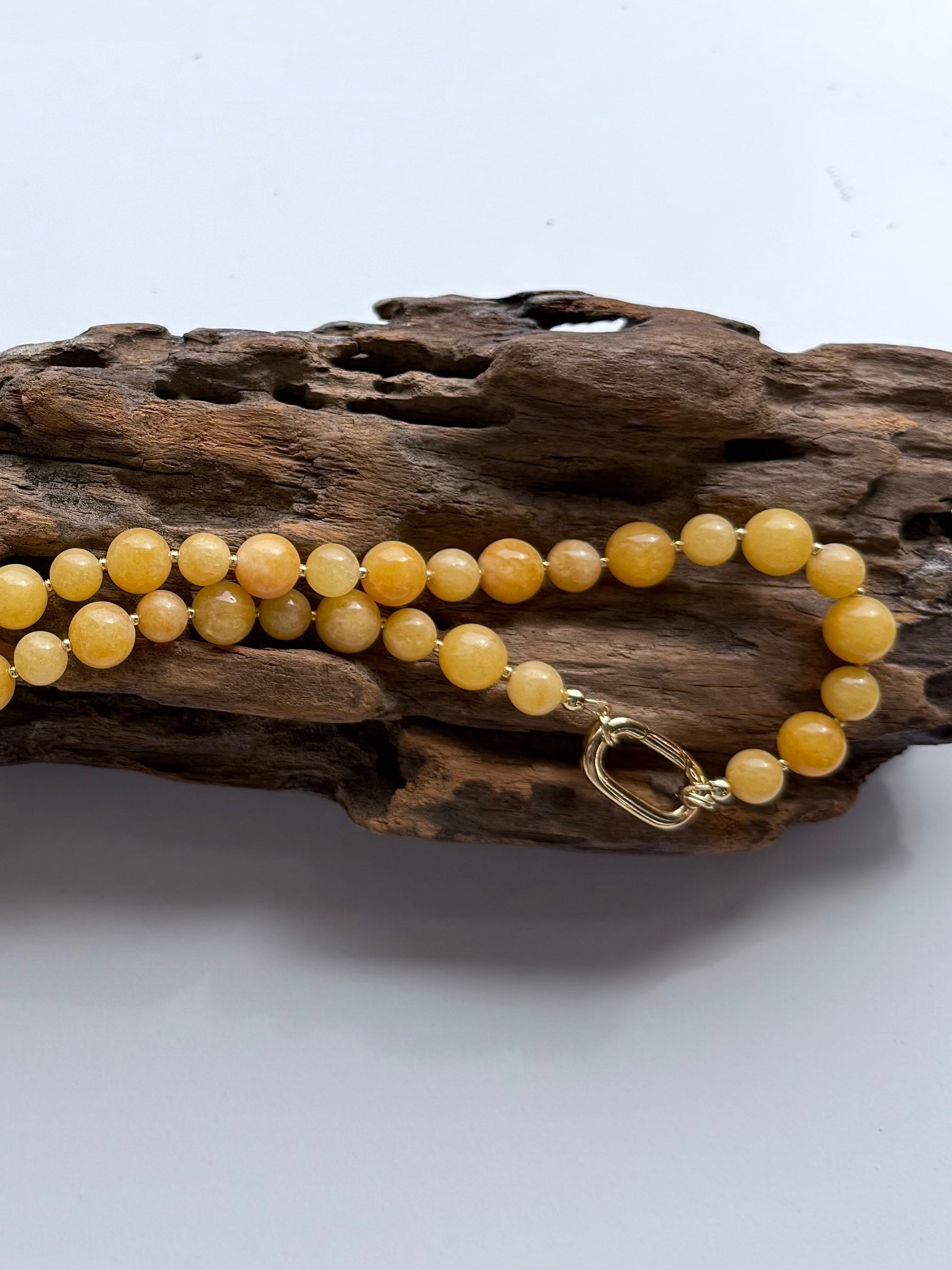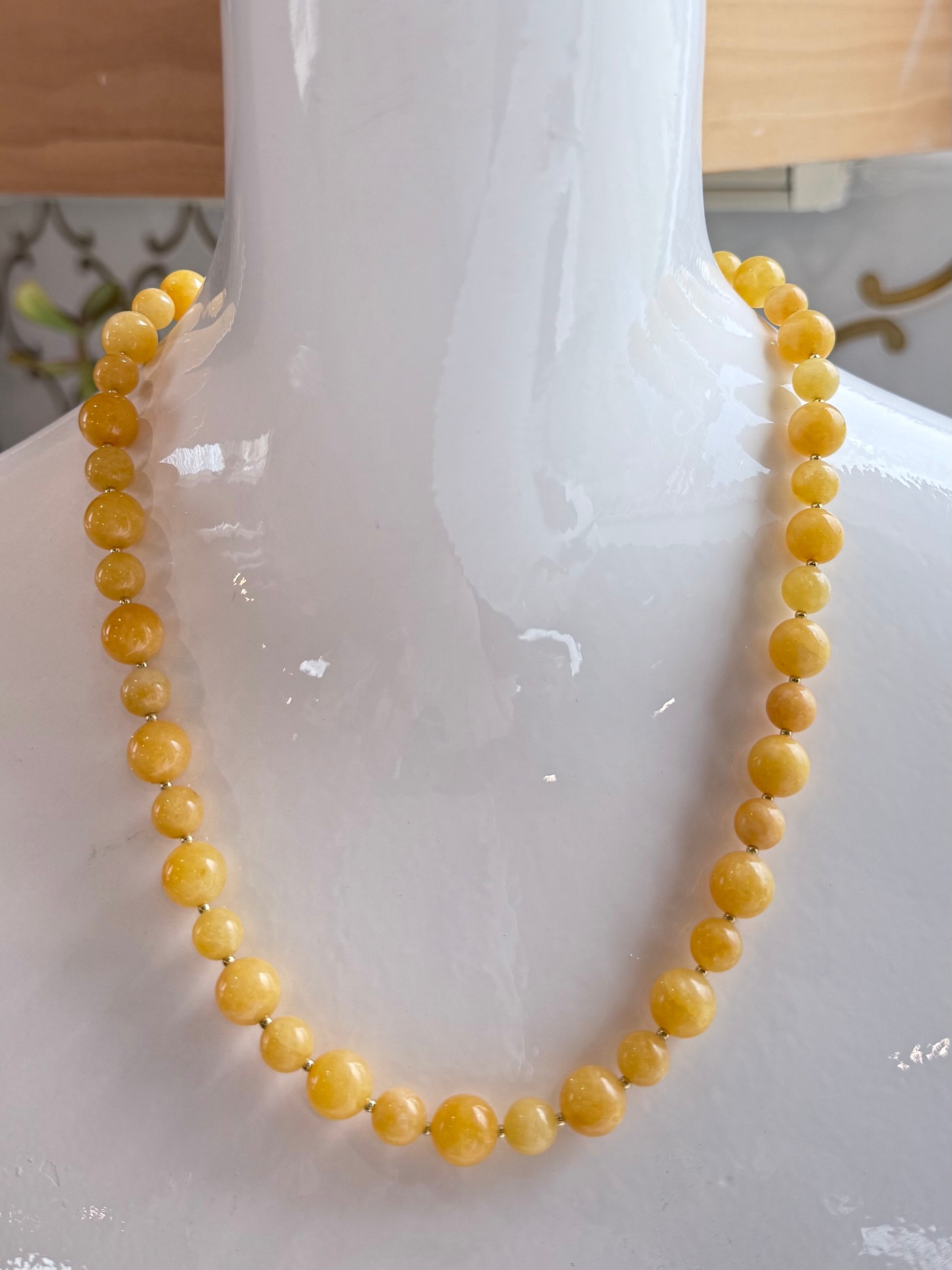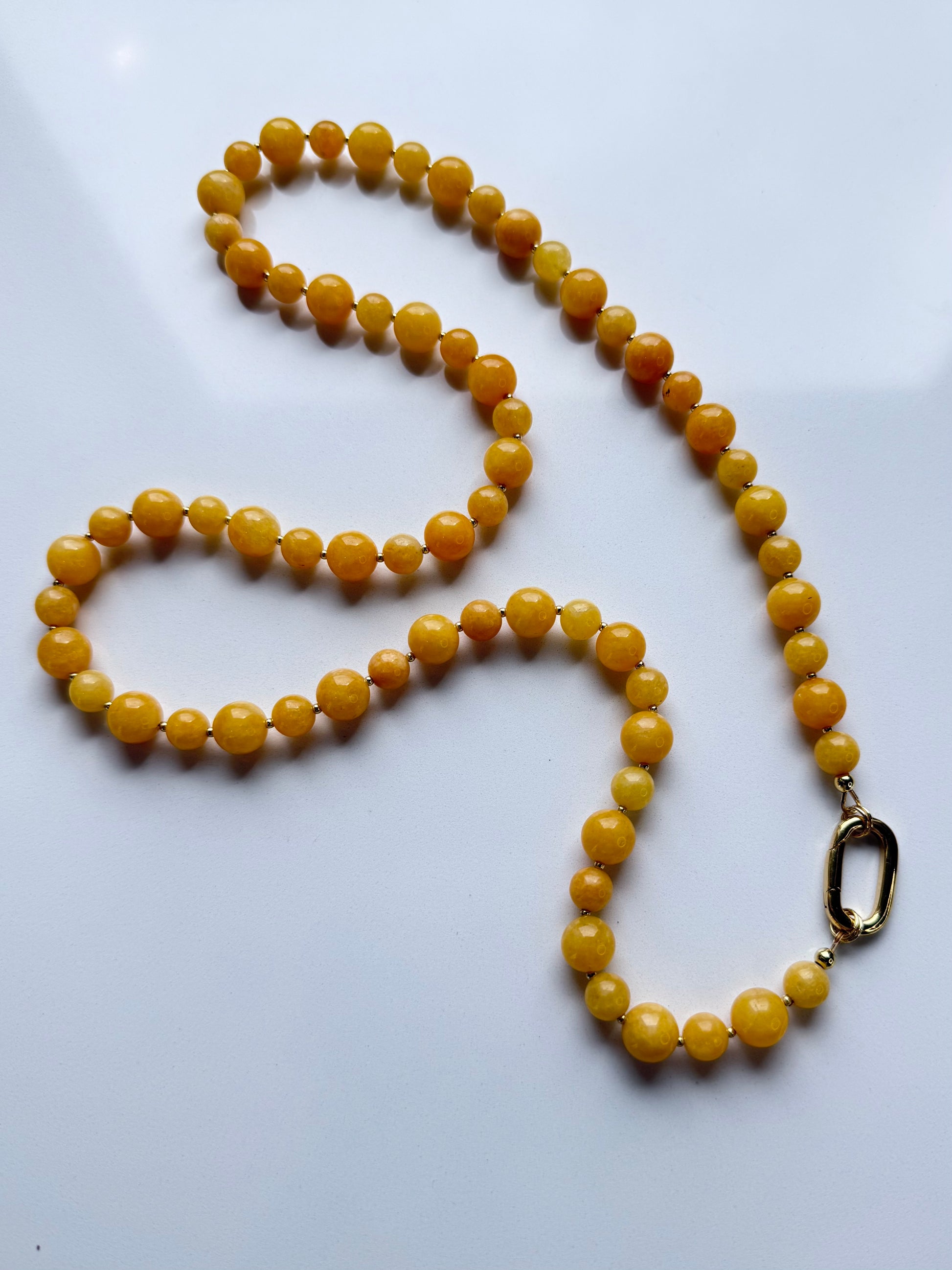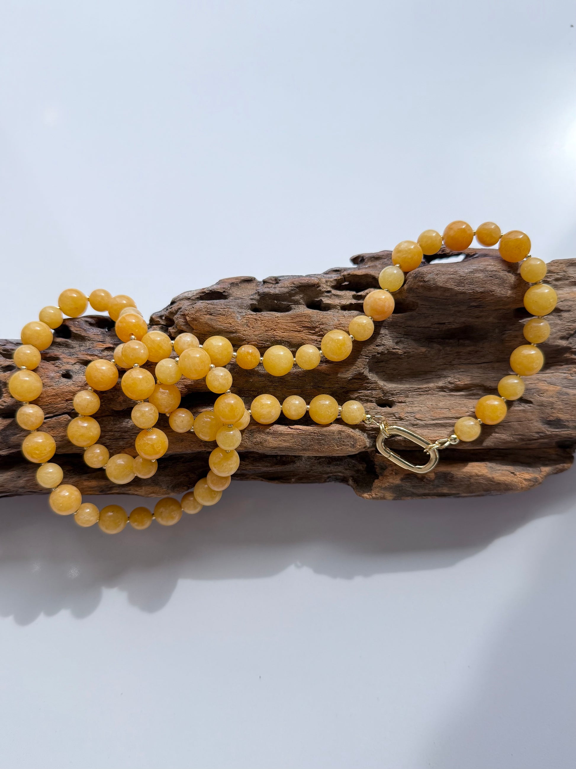 A 28” strand of smooth 8mm yellow jade beads, softly radiant and rich with golden warmth. Each bead is accented by 14k gold-filled 2mm spacers and finished with a polished 14k gold-filled carabiner clasp. Effortless, luminous, and unmistakably refined—the kind of piece that makes subtle look stunning.