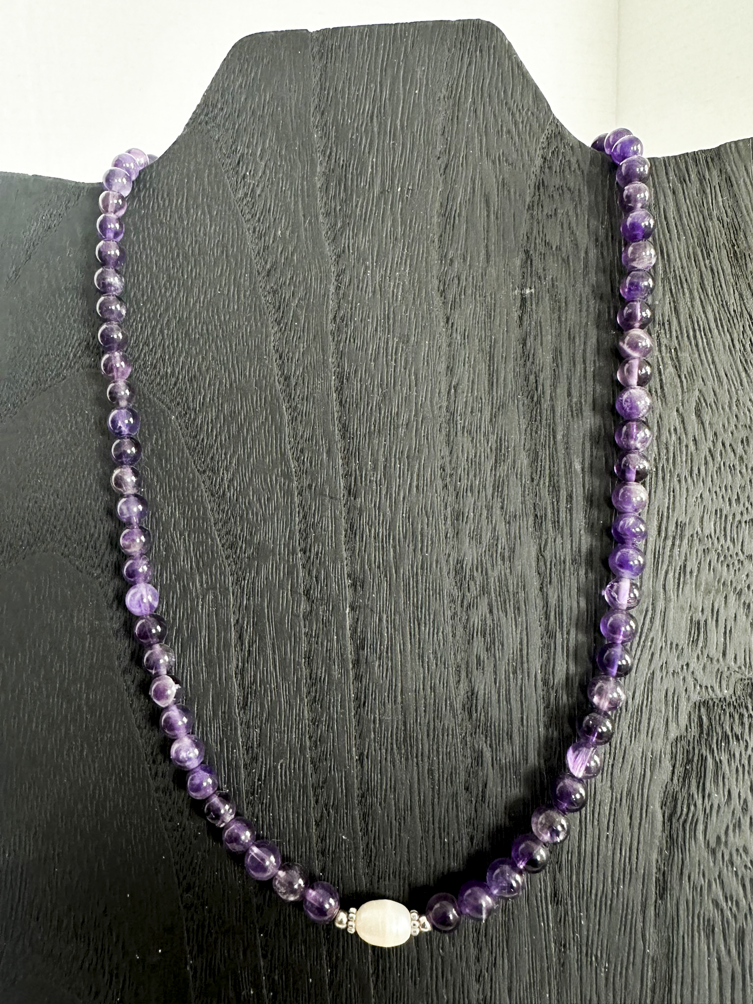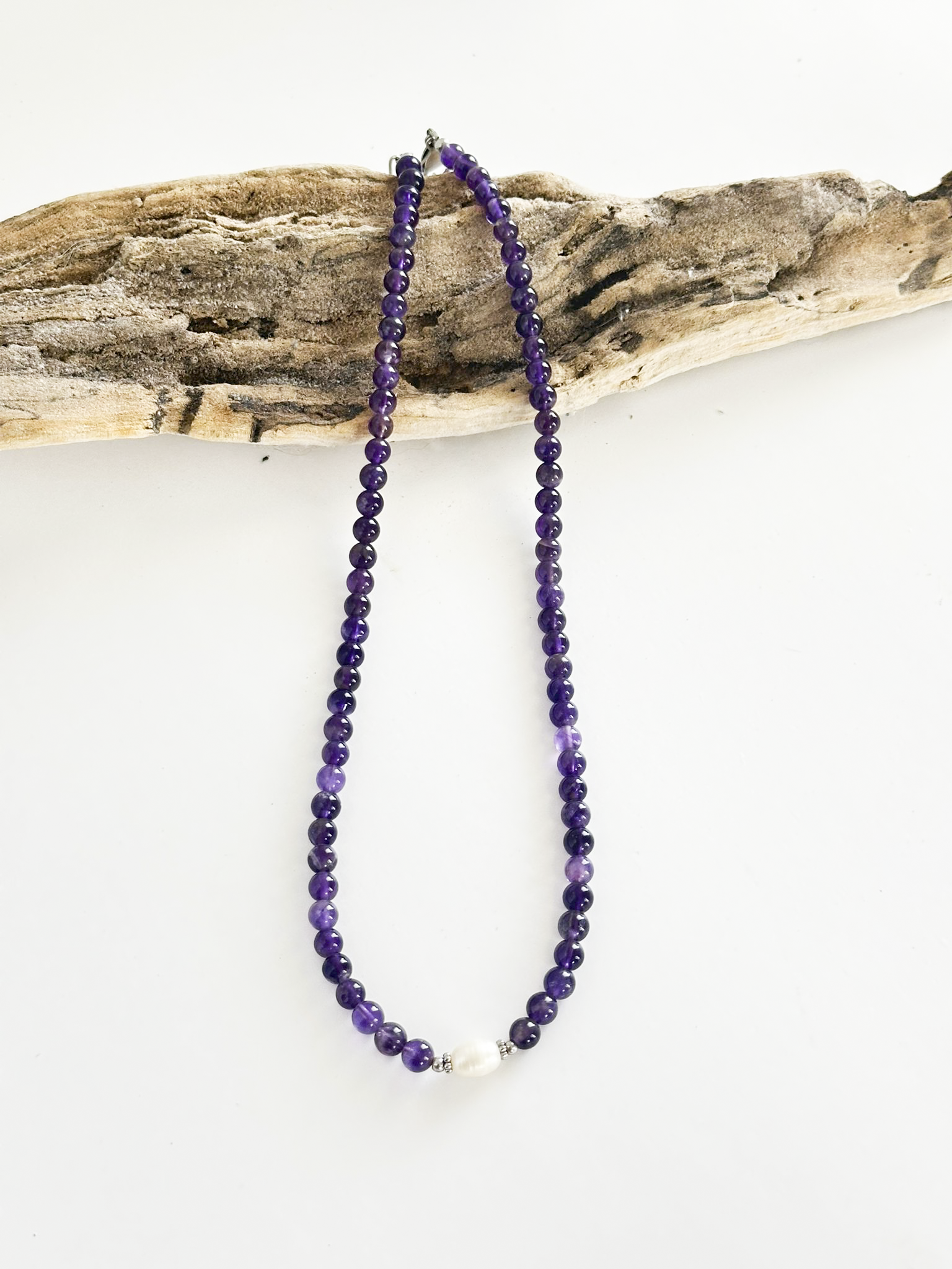 A strand of rich, 6mm genuine amethyst beads in velvety shades of purple, highlighted by a luminous freshwater pearl and sterling silver accents. Capturing the quiet magic of dusk — serene, elegant, and timeless.