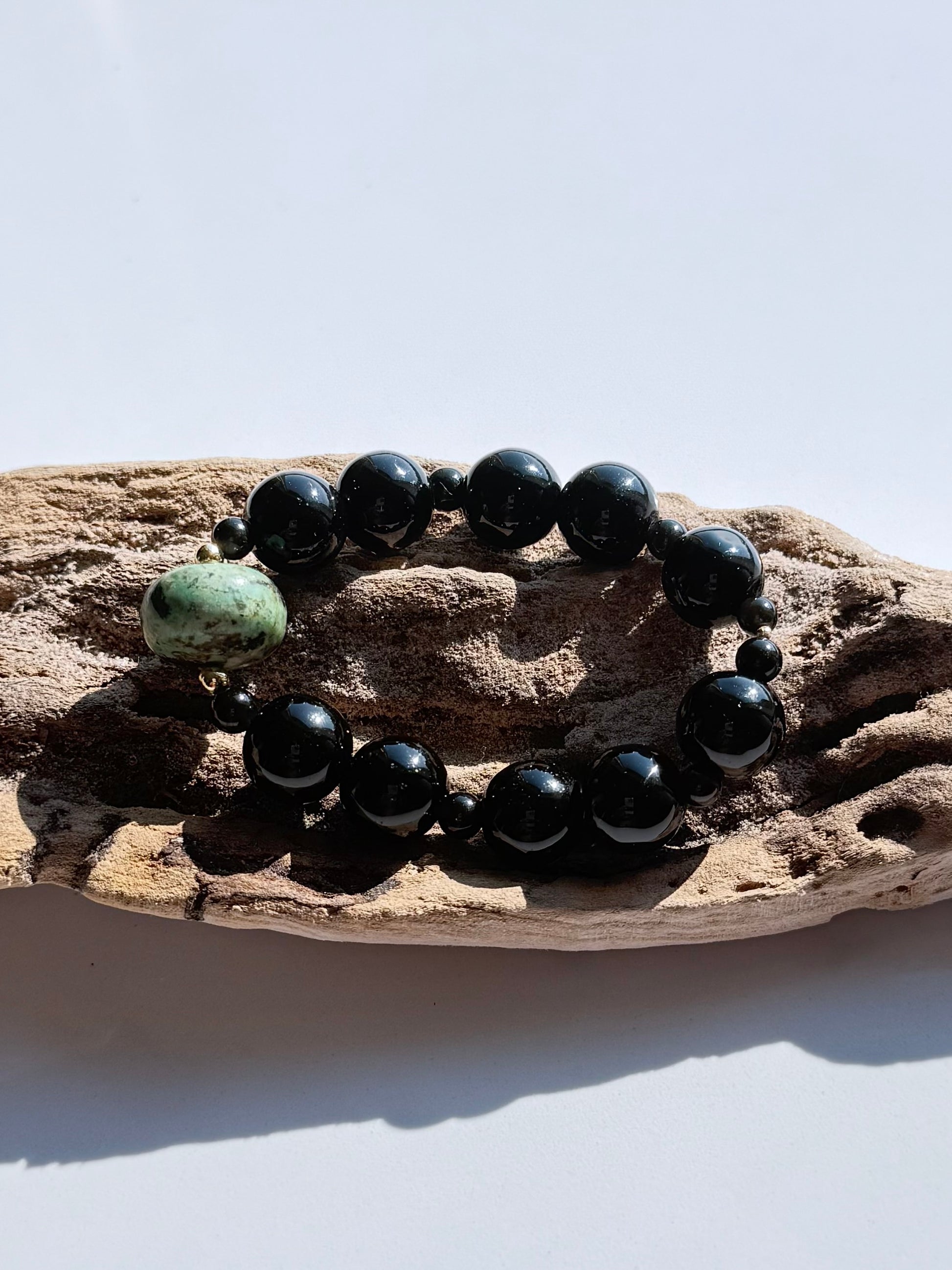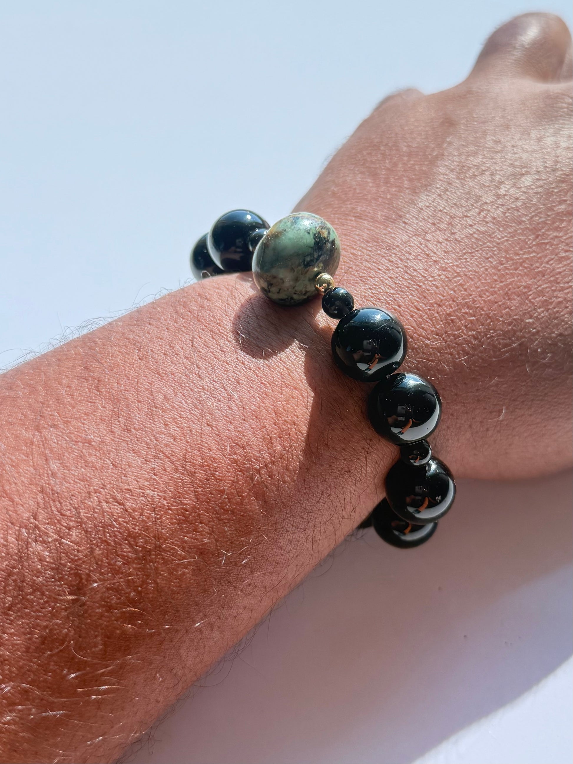 Crafted for those who refuse ordinary. This 7” bracelet pairs glossy 15mm black onyx beads with a bold 20mm jasper rondelle centerpiece. The contrast of deep, mirror-like onyx and earthy jasper creates a look that’s grounded, powerful, and timeless. Striking on its own or stacked, it’s designed to bring presence to every outfit.