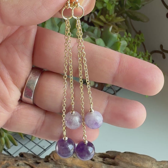 A refined double-drop earring featuring natural amethyst in two softly contrasting tones, chosen for their depth, clarity, and subtle variation. Each stone is suspended from a delicate gold-filled chain and finished with gold-filled leverback closures for comfort, balance, and everyday wear.