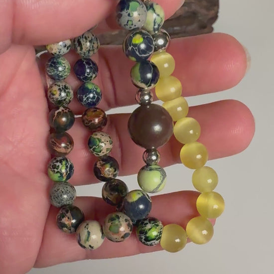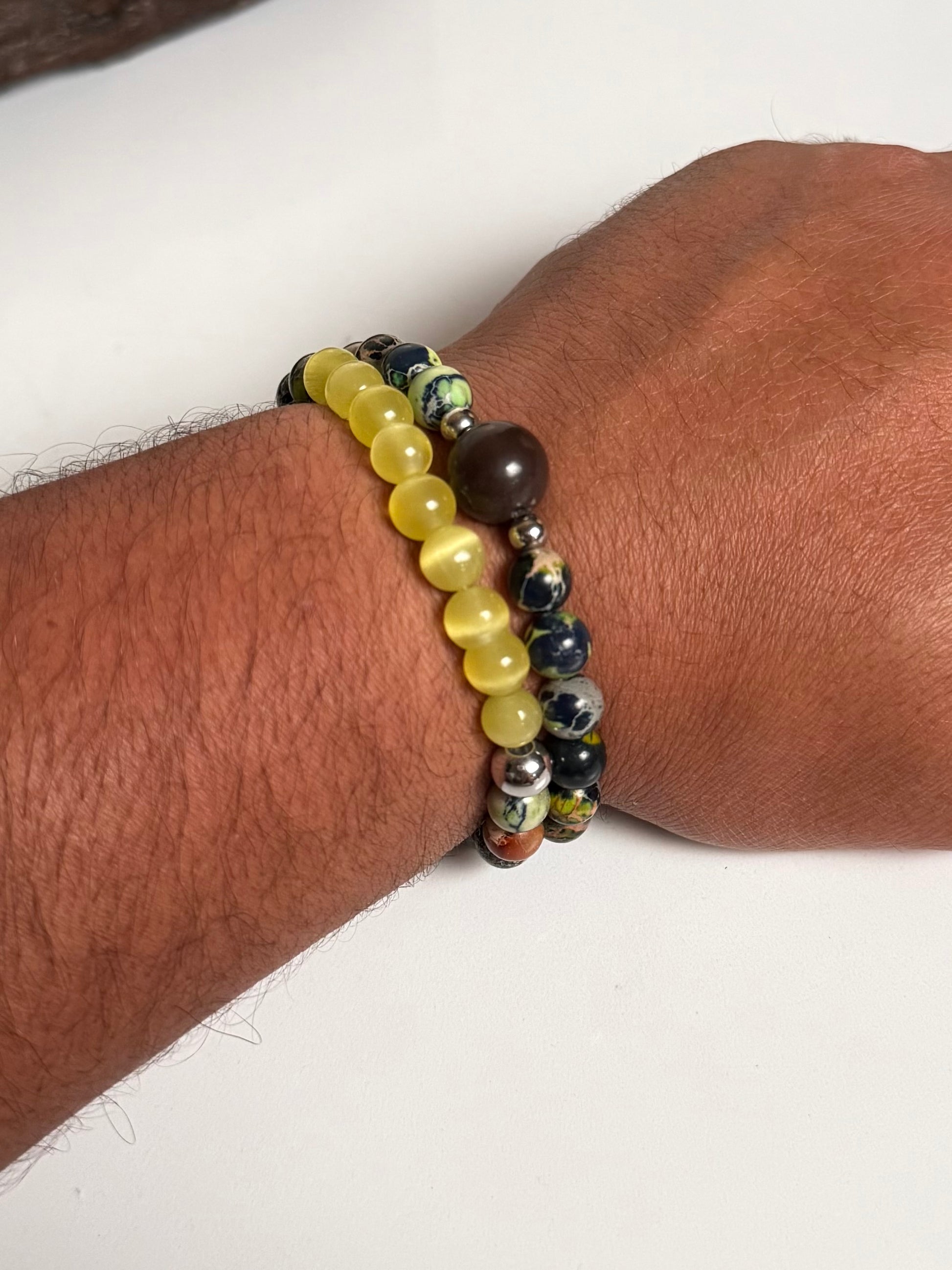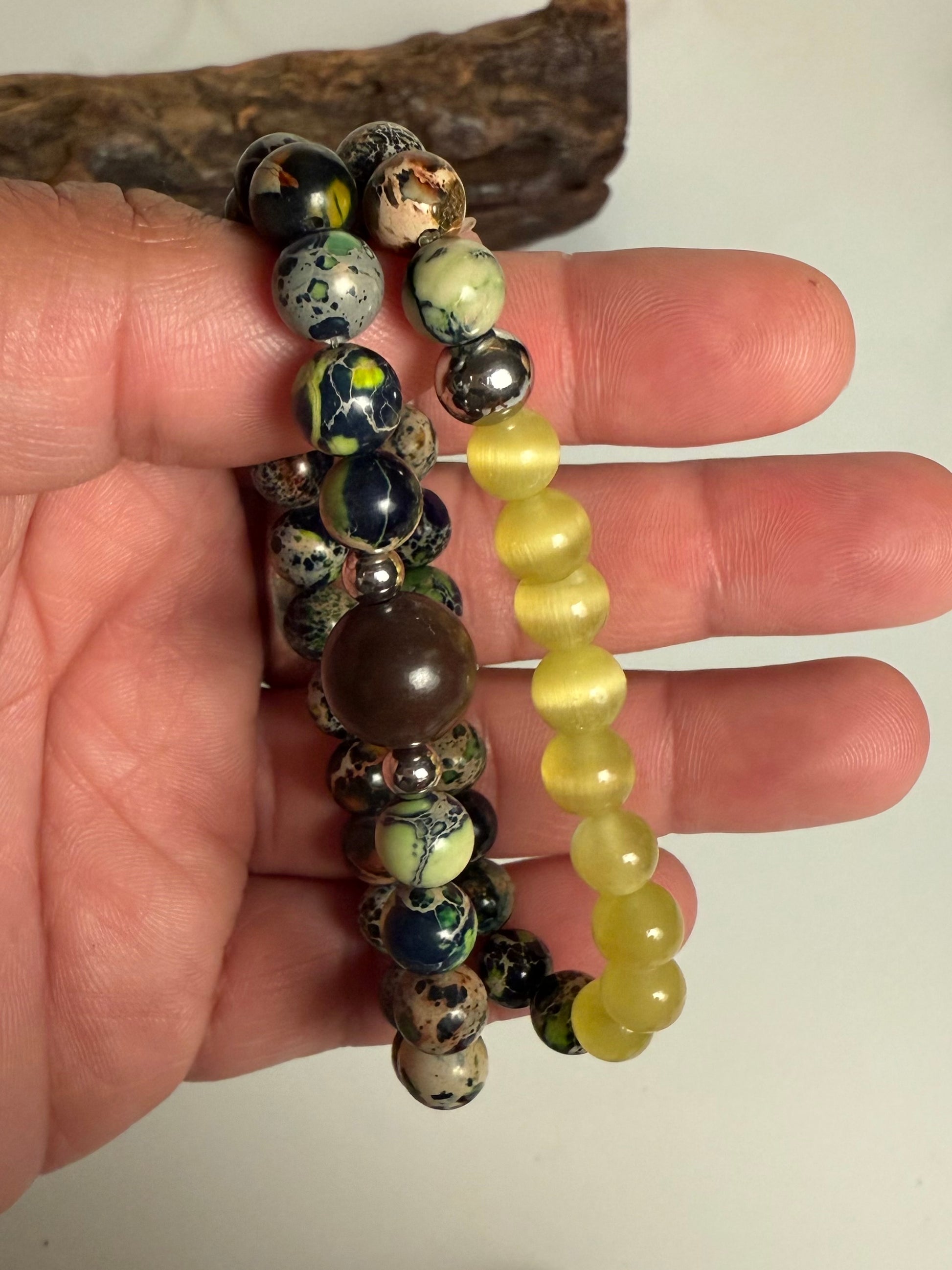 A beautifully balanced duo designed for the ones who loves earthy elegance with a touch of unexpected color. This two-bracelet set pairs richly patterned natural gemstone beads—swirls of forest green, navy, cream, and warm brown—with a luminous strand of soft golden-yellow cat’s eye beads.